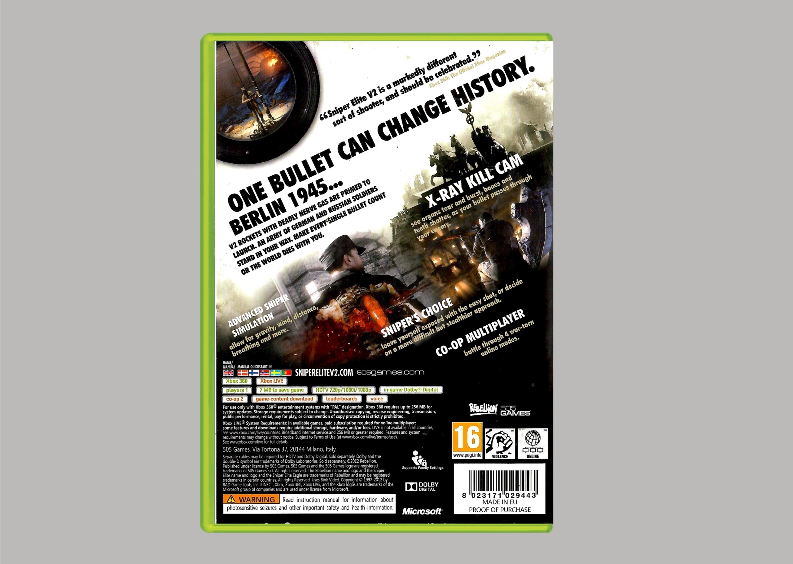 Оплачивая «XBOX 360 SNIPER ELITE V2», вы можете быть уверены, что данный товар из каталога «Microsoft Xbox 360» будет доставлен из Польши и проверен на целостность. В цене товара, указанной на сайте, учтена доставка из Польши. Внимание!!! Товары для Евросоюза, согласно законодательству стран Евросоюза, могут отличаться упаковкой или наполнением.
