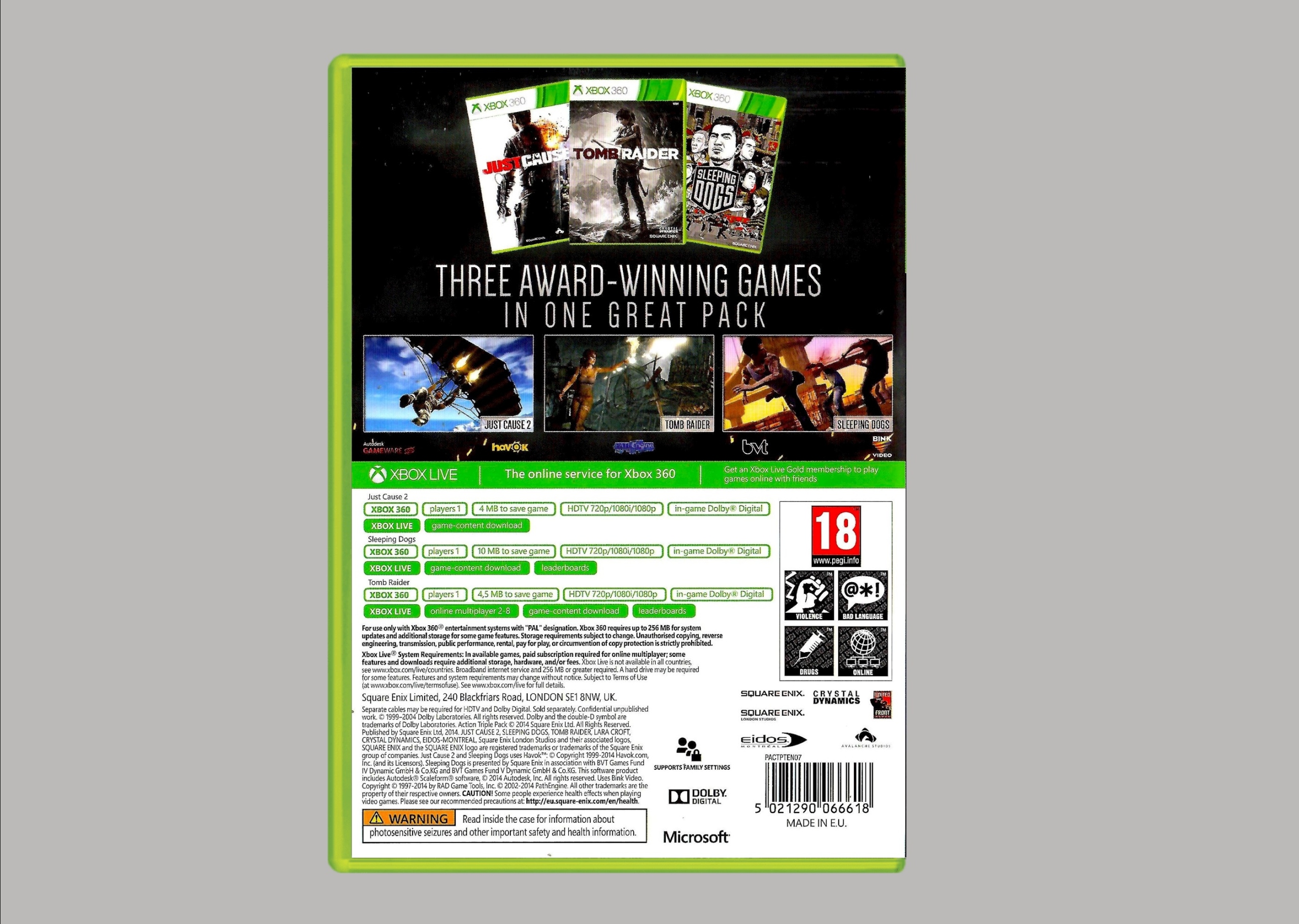 XBOX 360 ULTIMATE ACTION TRIPLE PACK JUST CAUSE 2 SLEEPING DOGS TOMB RAIDER