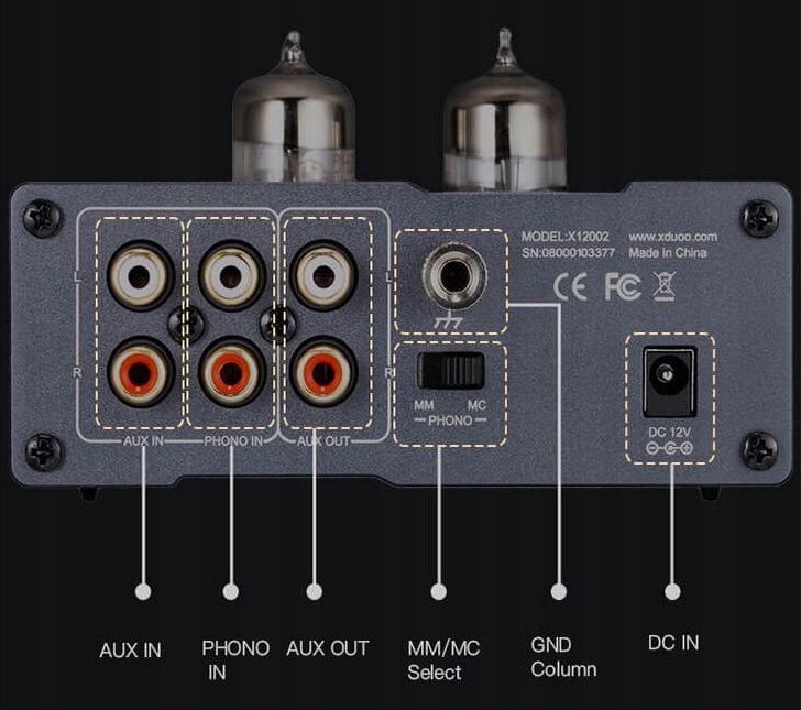 xDuoo MP-01 оснащений не тільки фоно-входом, а й входом AUX. Він дозволяє підключати фірмовий ламповий попередній підсилювач до програвачів MM і MC (вибираються за допомогою спеціального перемикача), комп’ютерів, CD-програвачів, телевізорів, цифро-аналогових перетворювачів або аудіоплеєрів.