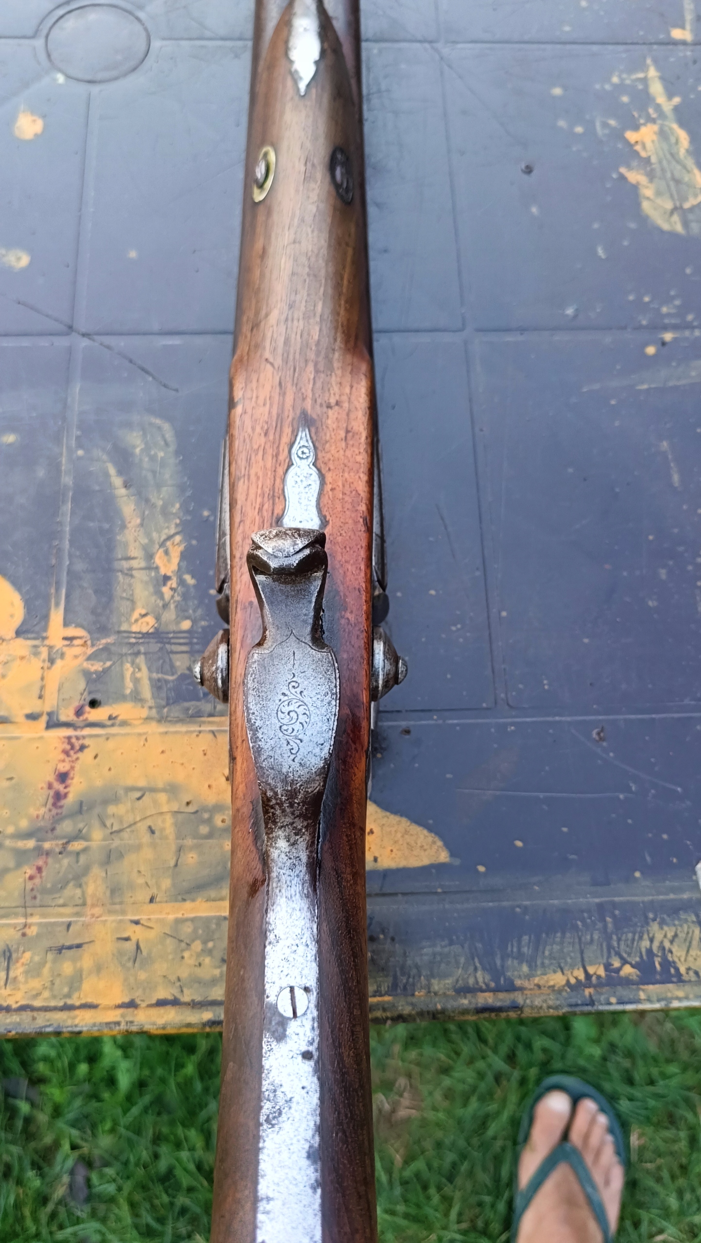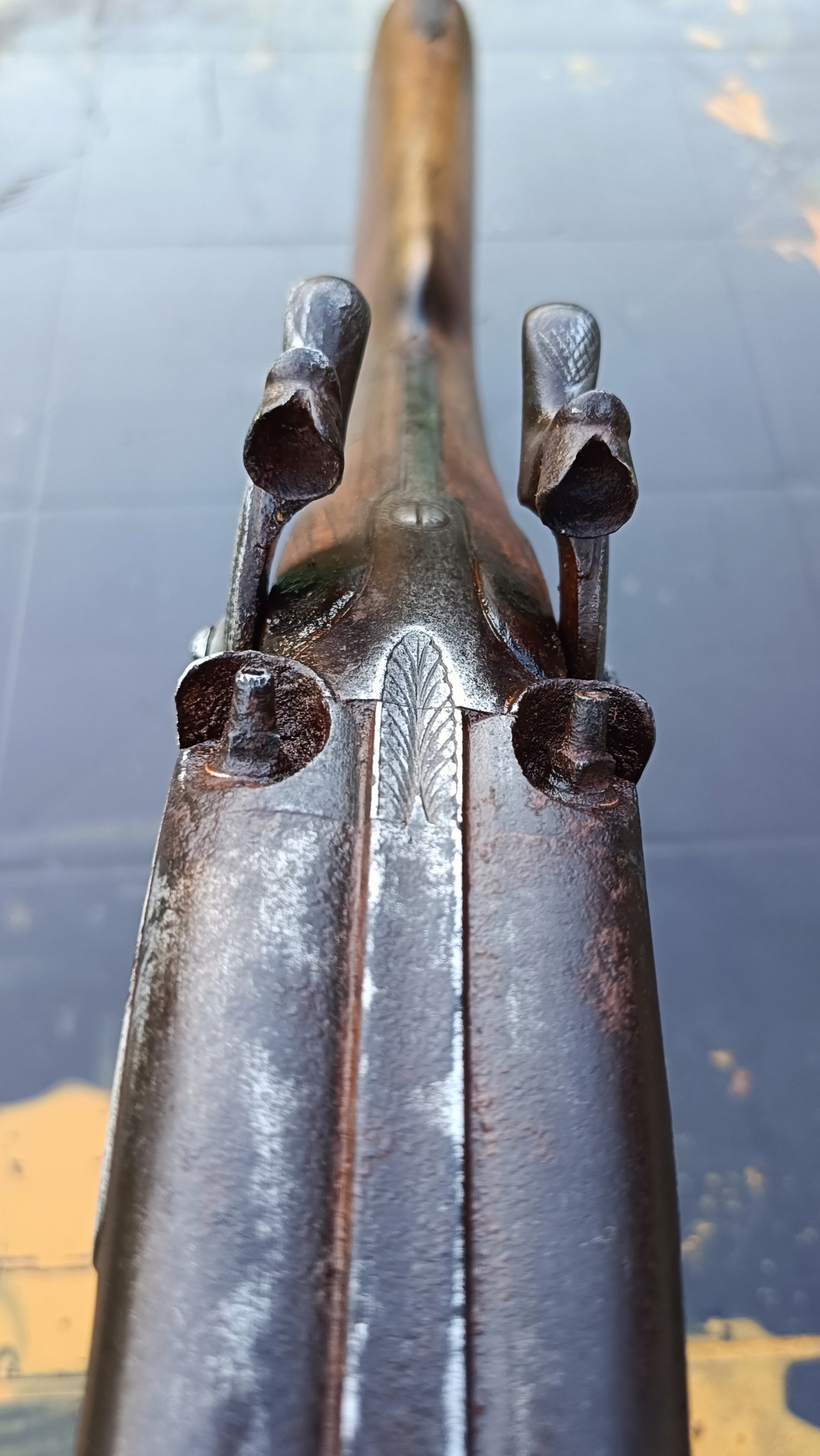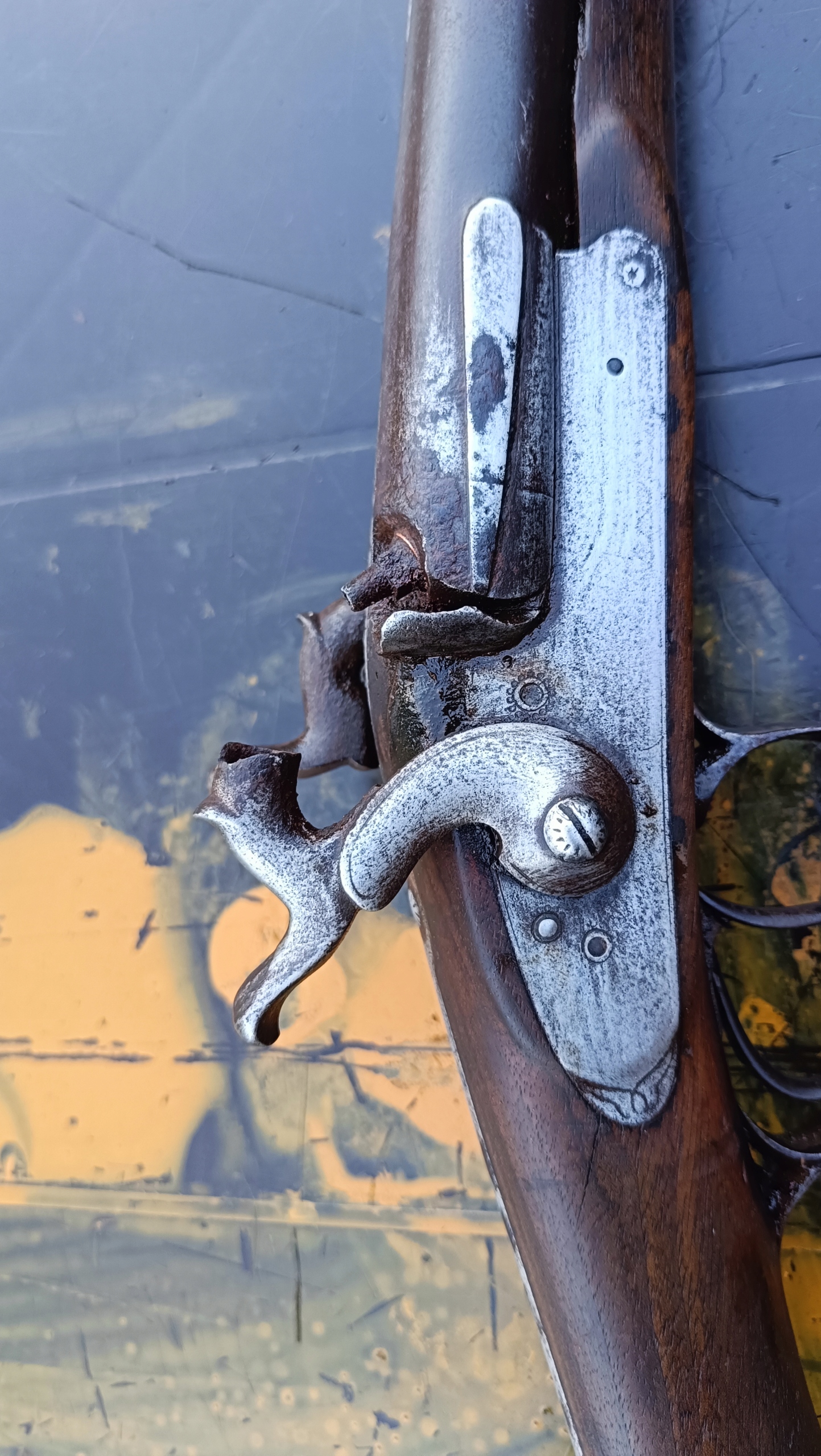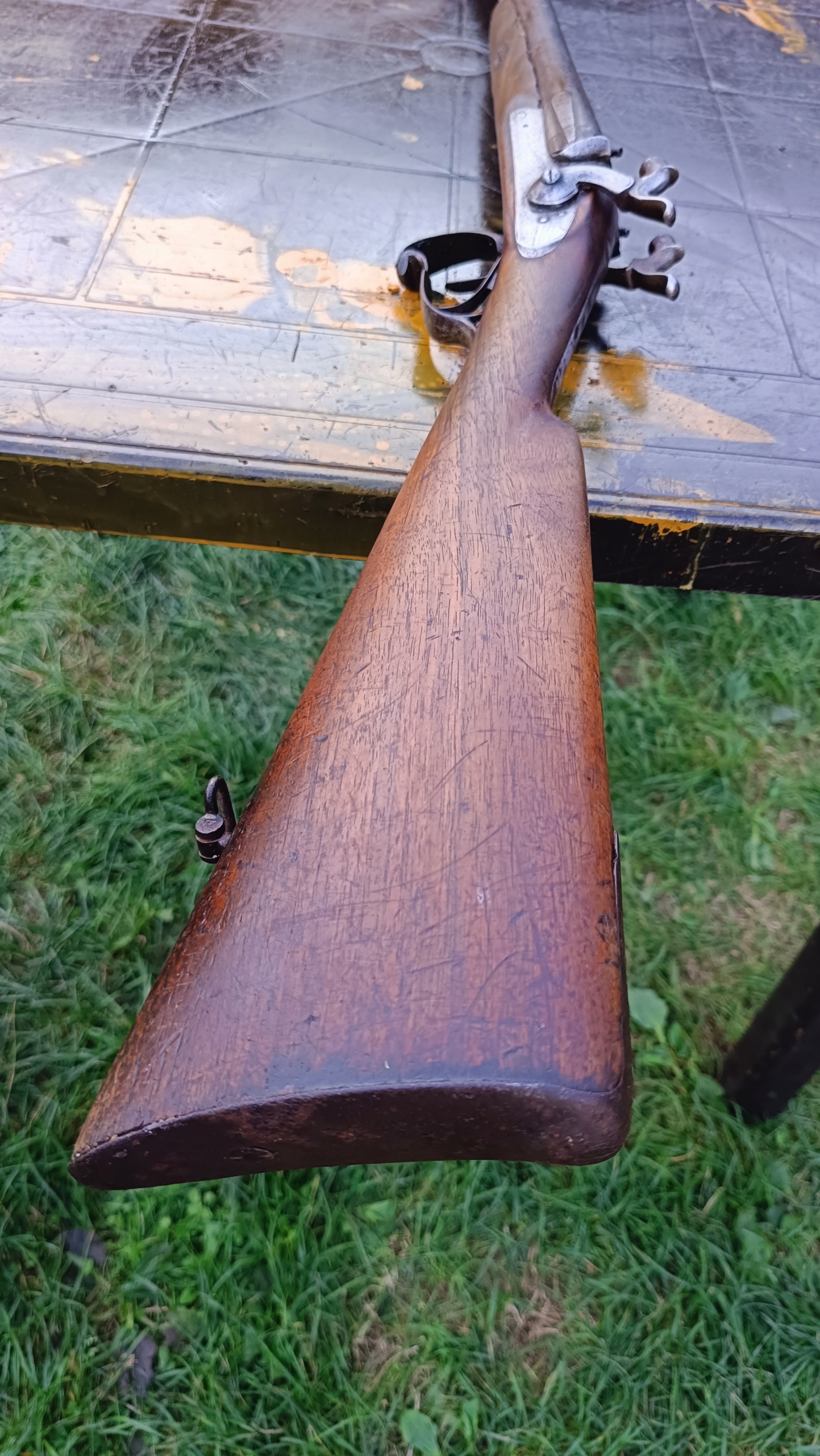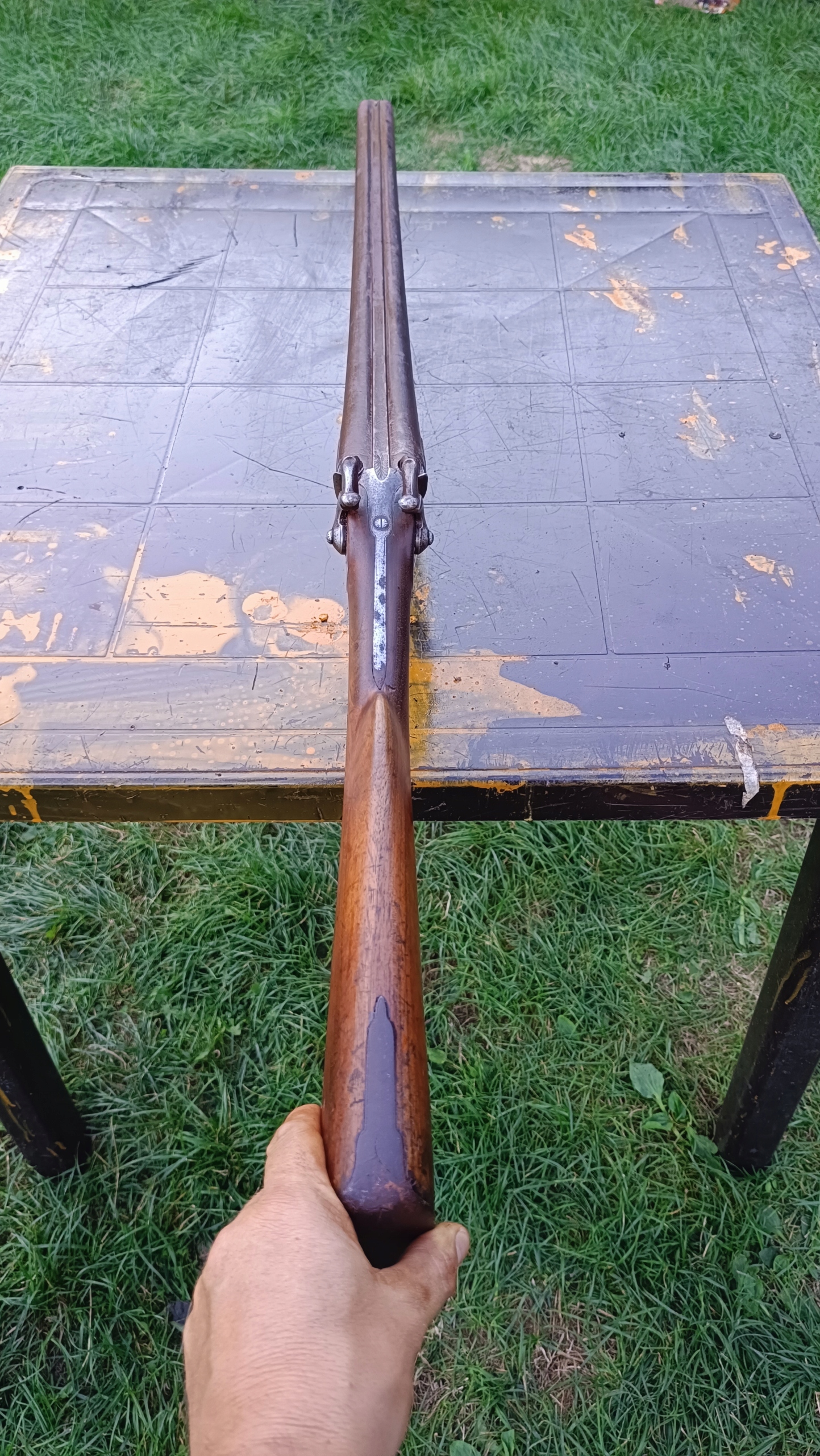 завантажено з фронту. Можна вистрілити сухий постріл, подвійне напруження. Замки тригера затягуються двома брусками. Пряма бочка, незначні вм'ятини в підготовці. Дерево в хорошому стані. Каміни, які потрібно замінити.