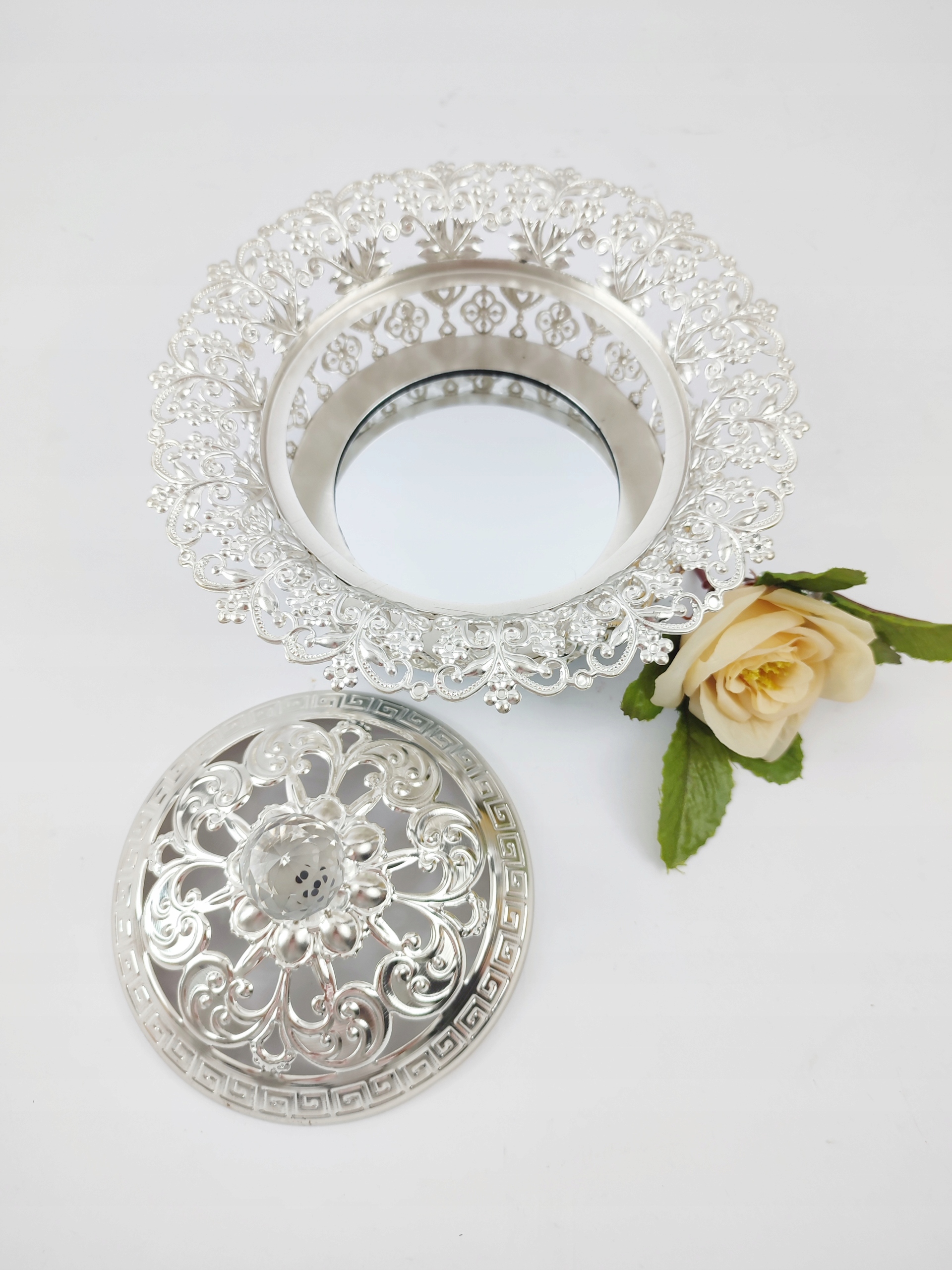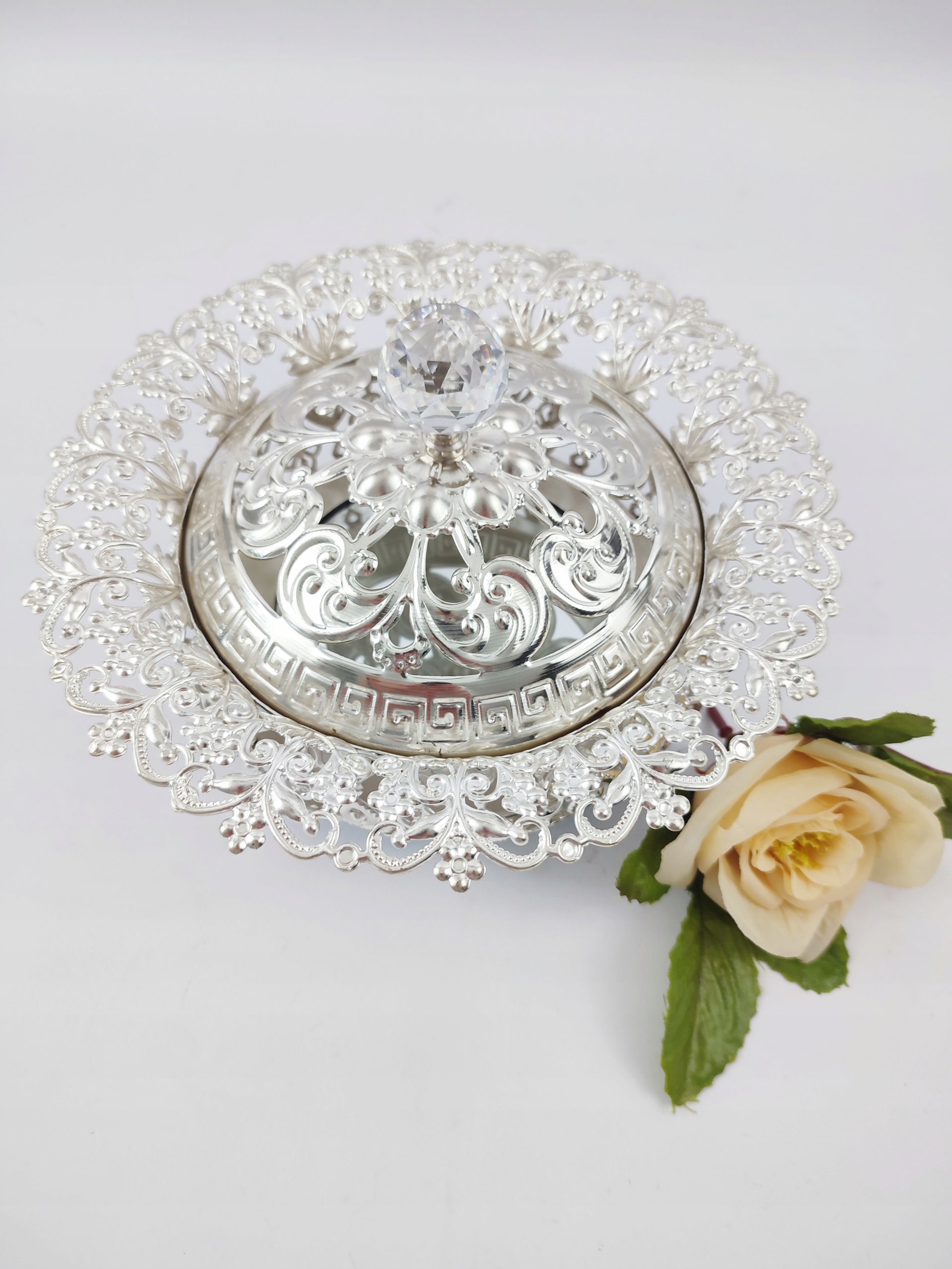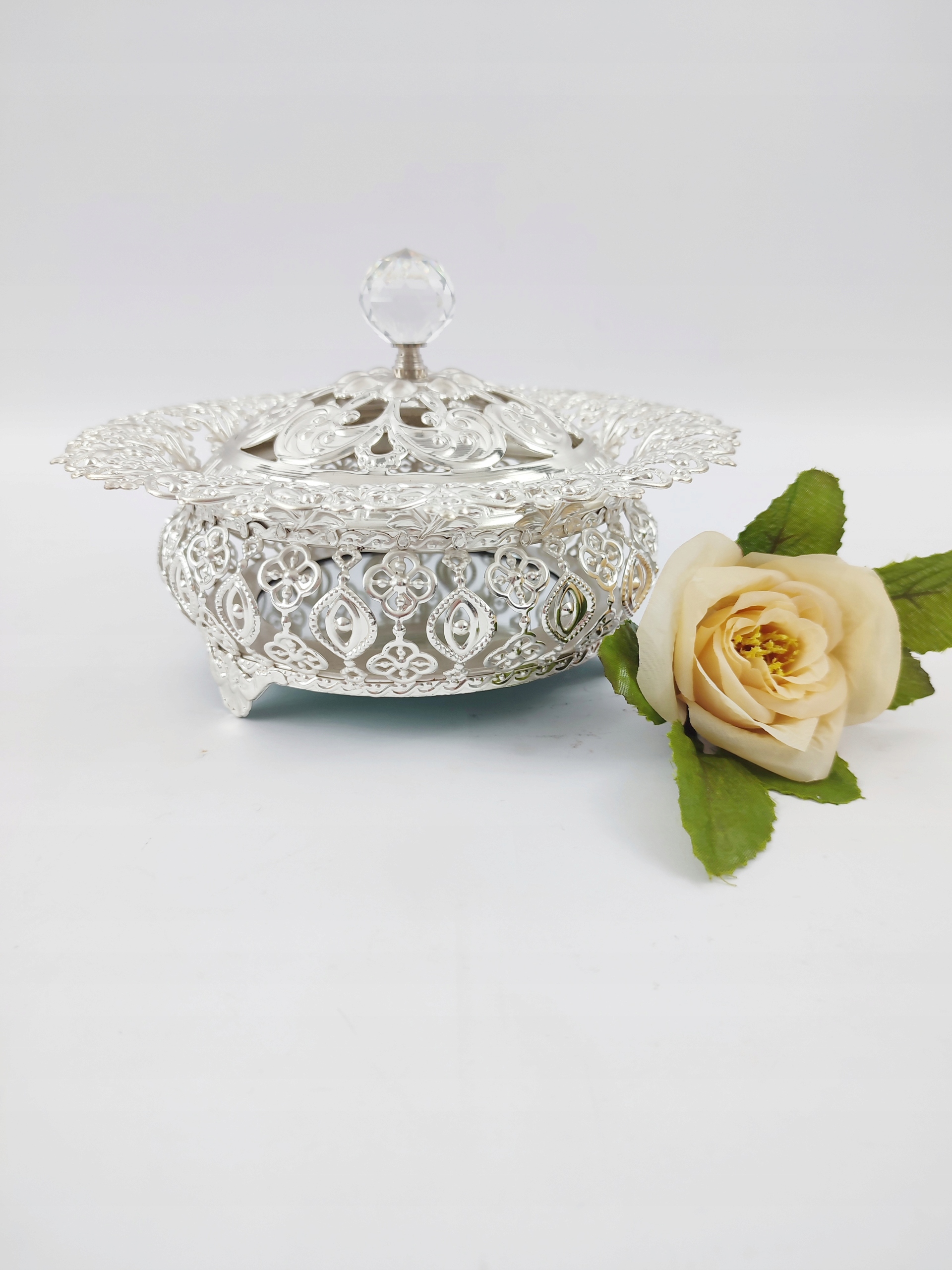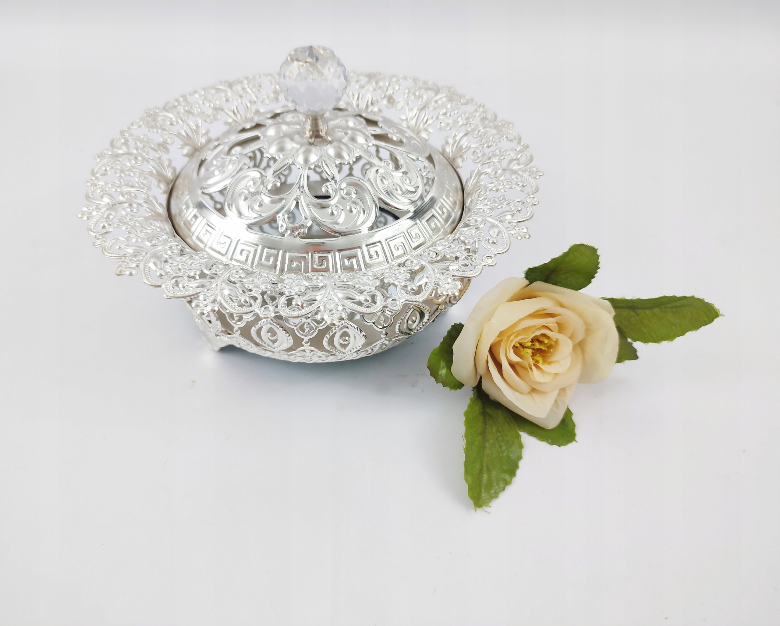 декоративна шоколадна коробка, що складається з металевої основи з відкритою роботою з кришкою та дзеркальним вставкою у золоті. Основа у верхній частині закінчилася кришталевою ручкою, цілою дуже ефективною, елегантною об'єктом на кожній таблиці та кожній таблиці. Ємісний внесок можна використовувати для зберігання улюблених печива чи інших солодощів, а також для різних дрібничок. Ми рекомендуємо як практичний подарунок.