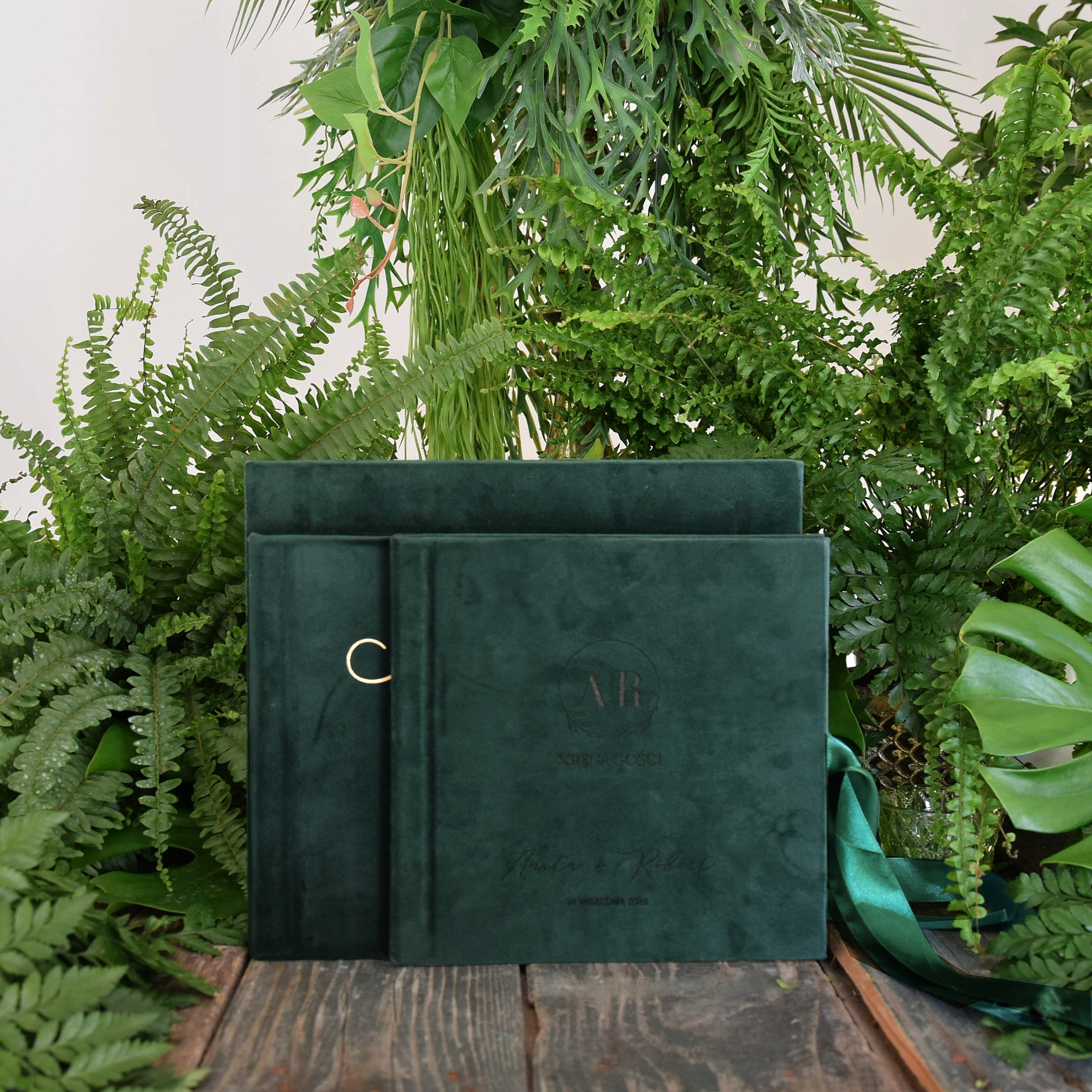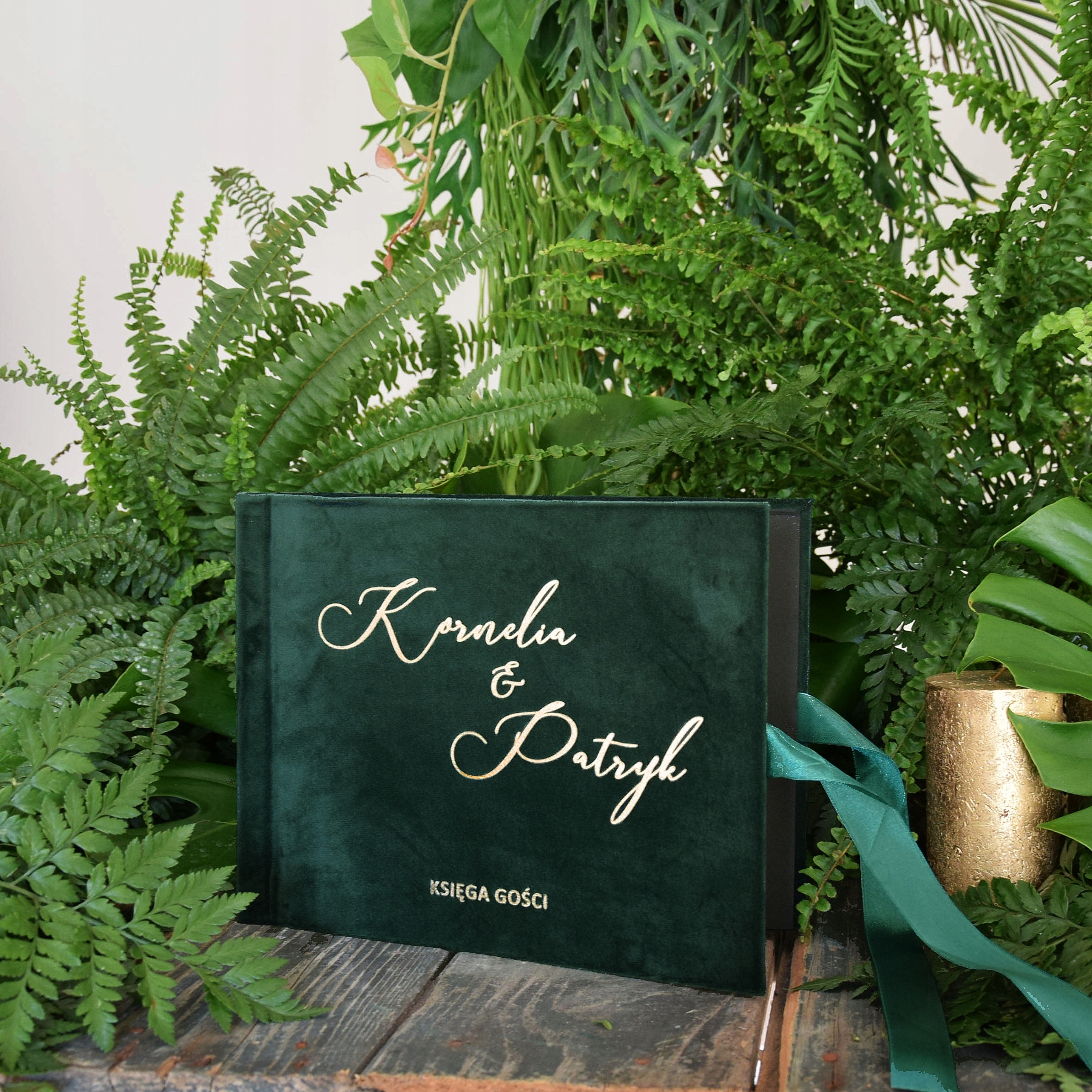 Темно-зелений є хітом останніх років років на весіллях, тому ми маємо для вас унікальну пропозицію. Персоналізована гостьова книга, яка відповідатиме стилю кожного весілля. Велюровий чохол, позолочені написи, красива стрічка та листівки чекають слів ваших гостей.