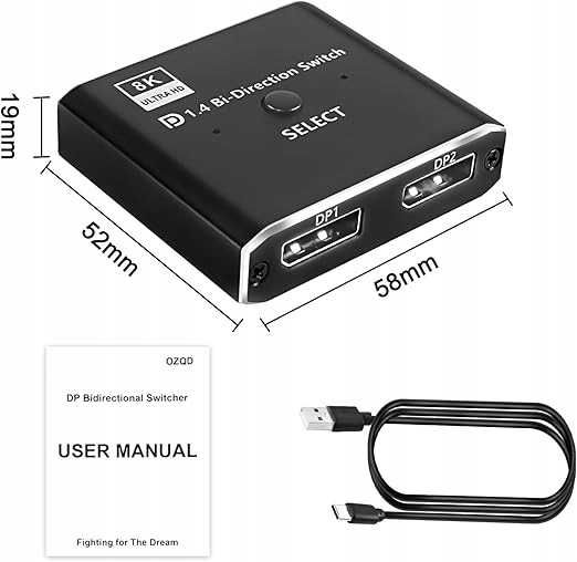 - Двонаправлений перемикач DP: двонаправлений перемикач DisplayPort може підключати два джерела сигналу DP до дисплея DP або підключати джерело сигналу DisplayPort для перемикання між двома дисплеями. Натисніть кнопку «Вибрати», щоб переключатися між двома екранами. (Важлива примітка: дві реклами не можуть відображатися одночасно.) USB-кабель живлення для використання