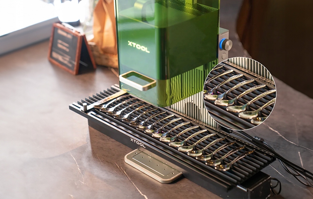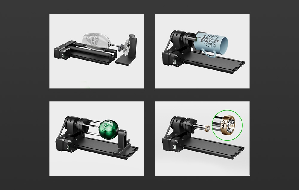 Поворотна насадка RA2 Pro дозволяє гравірувати об’єкти різних форм, у тому числі циліндричні та сферичні. Завдяки можливості швидкого і точного управління насадка значно розширює функціональні можливості гравера xTool F1, дозволяючи створювати більш складні та детальні малюнки.
