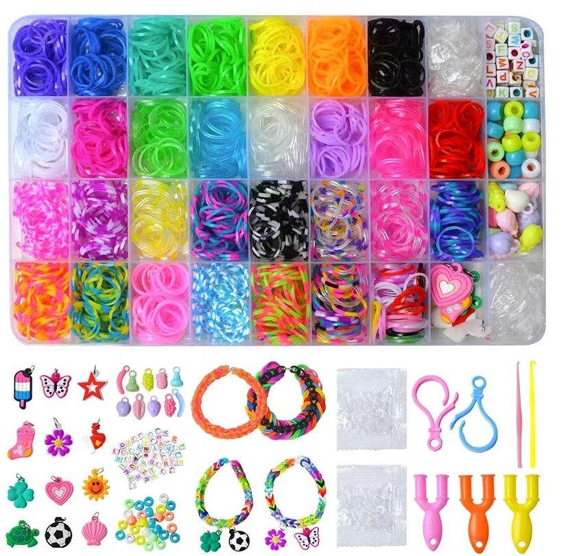Наш набір включає широкий вибір кольорів гумних смуг , що дозволяє дитині створювати нескінченні комбінації та шаблони, висловлюючи вашу індивідуальність. Створення браслетів дуже просто.