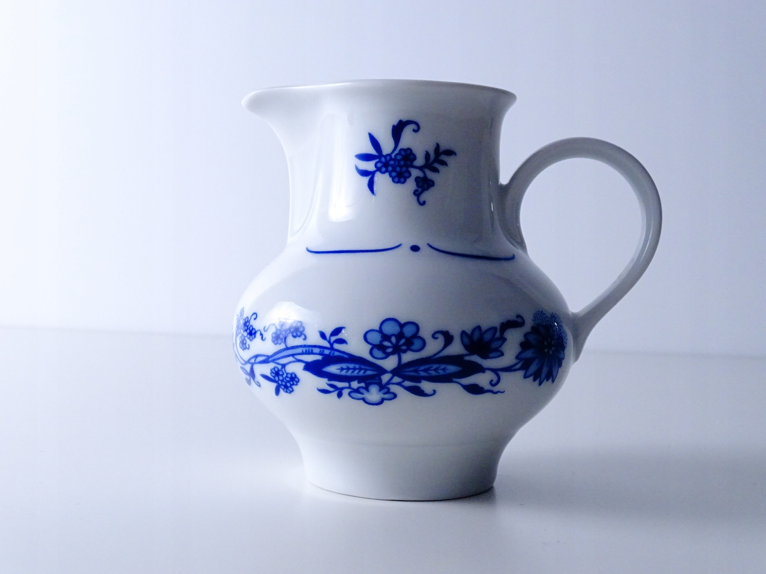 Дуже гарний молочник з білосніжної порцеляни, прикрашений класичним цибульним візерунком під глазур'ю.