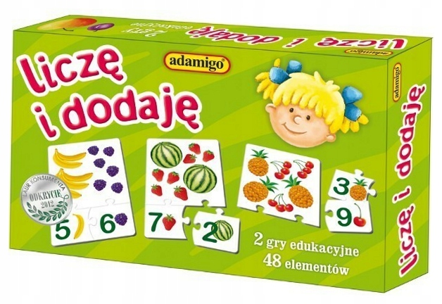Я рахую і додаю, що це складається з 48 головоломок, з яких можна розмістити 16 наборів. Кожен з них складається з великої головоломки з зображенням двох типів фруктів та двох менших з числами та фруктами, які відповідають кількості фруктів з великої головоломки. У середині коробки є інструкція з описом двох, також можна використовувати як головоломку під час гри з однією дитиною.