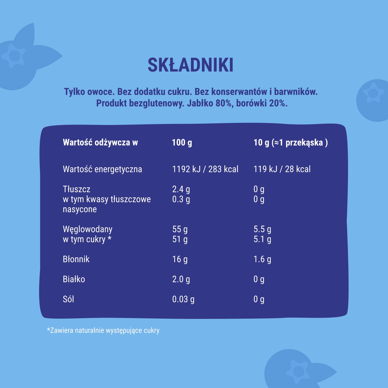 Rolls Apple-Borówka 500G 5AX100G. рулони мають 100% природний склад. Це просто фрукти і більше нічого! Вони завжди зроблені без додавання цукру, консервантів та барвників. Вони не містять глютену і не містять ГМО. >