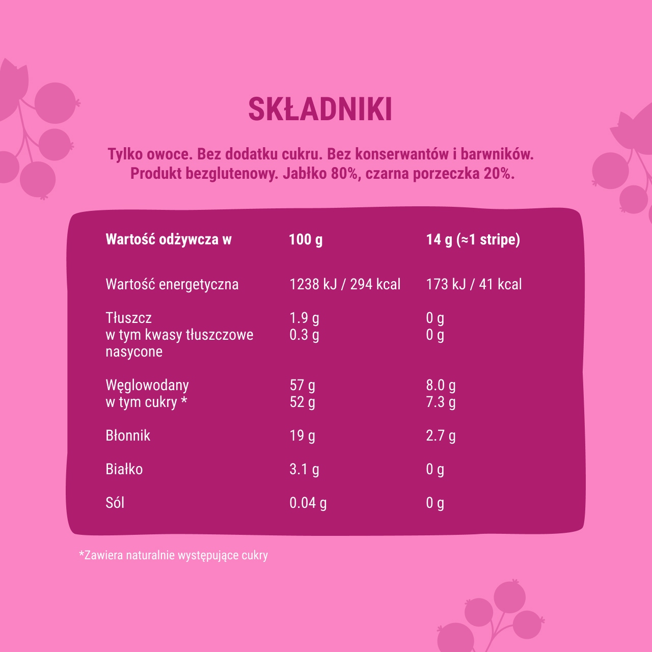 - Чистий склад. Страйпи мають 100% натуральний склад. Це просто фрукти і нічого більше! Вони завжди виготовляються без додавання цукру, консервантів і барвників. Вони не містять глютену та ГМО.