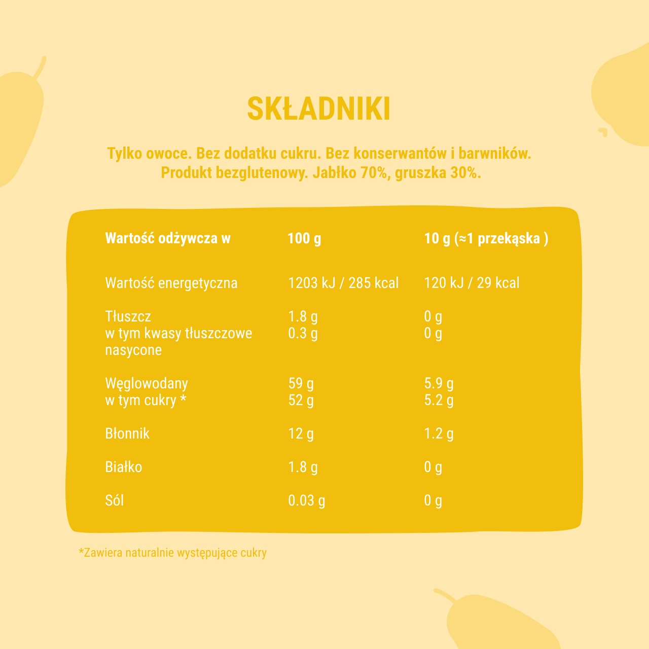 - Чистий склад. Роли мають 100% натуральний склад. Це просто фрукти і нічого більше! Вони завжди виготовляються без додавання цукру, консервантів і барвників. Вони не містять глютену та ГМО.