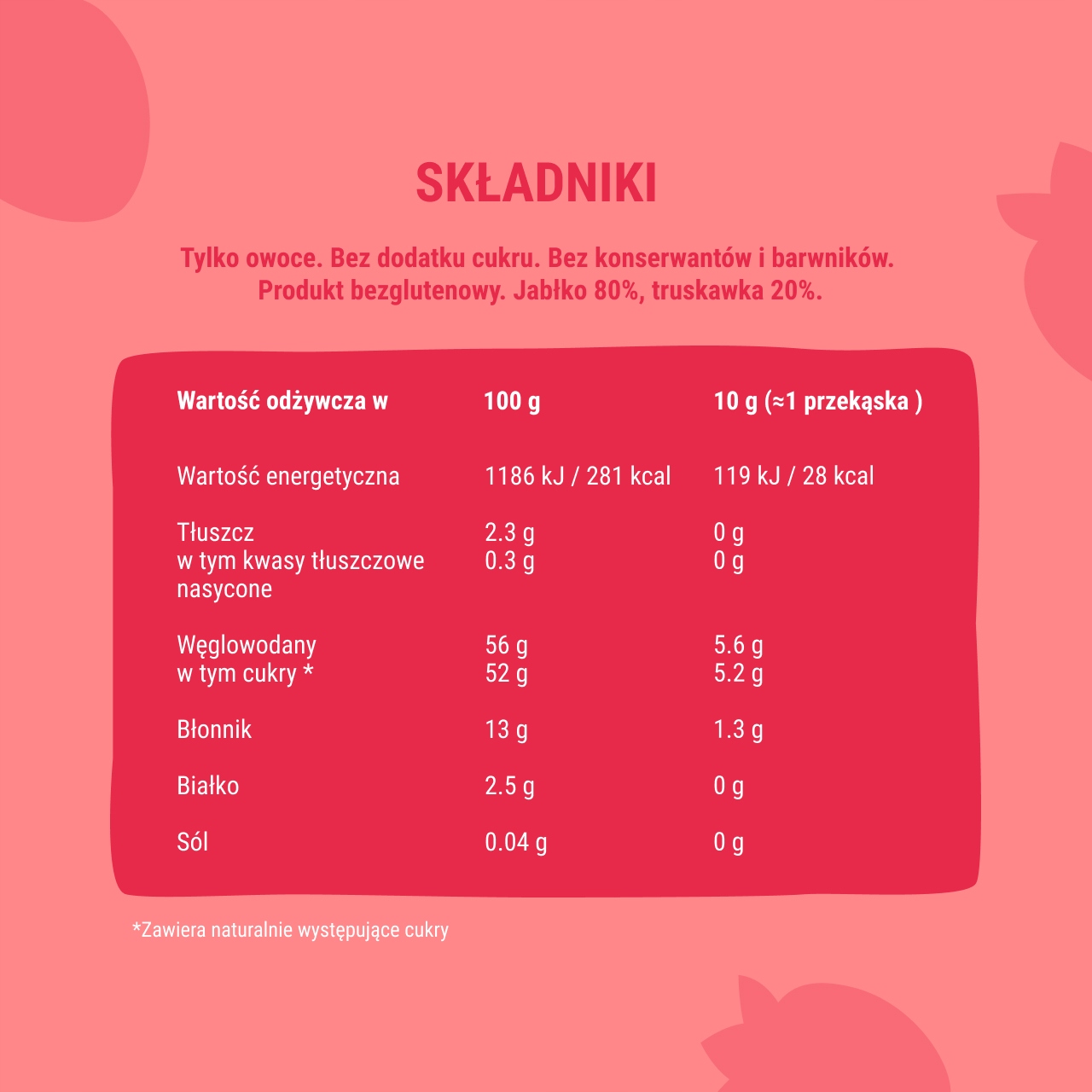 - Чисті інгредієнти. Роли мають 100% натуральний склад. Це просто фрукти і нічого більше! Вони завжди виготовляються без додавання цукру, консервантів і барвників. Вони не містять глютену та ГМО.