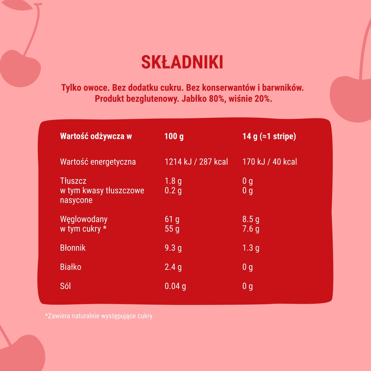 - Чистий склад. Страйпи мають 100% натуральний склад. Це просто фрукти і нічого більше! Вони завжди виготовляються без додавання цукру, консервантів і барвників. Вони не містять глютену та ГМО.