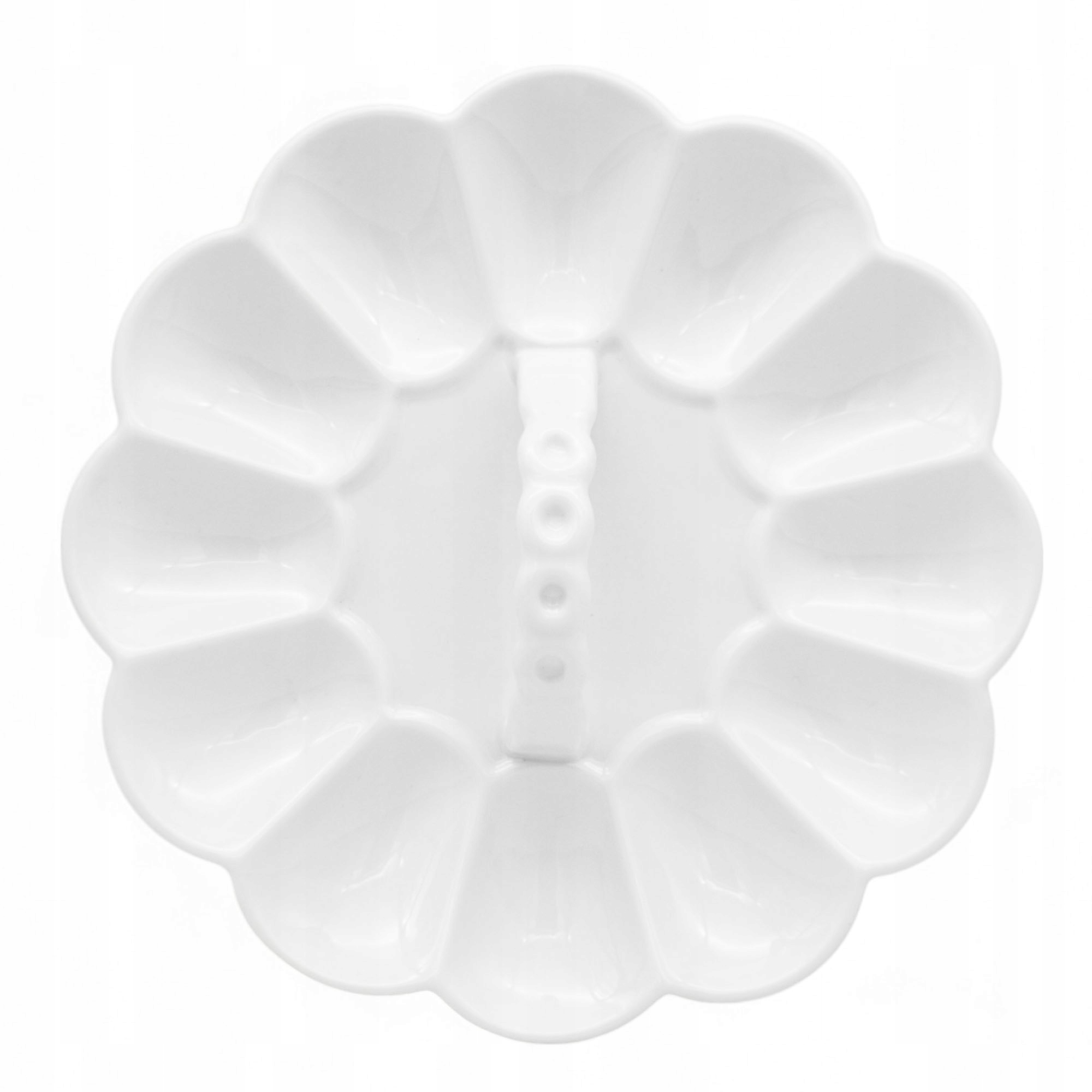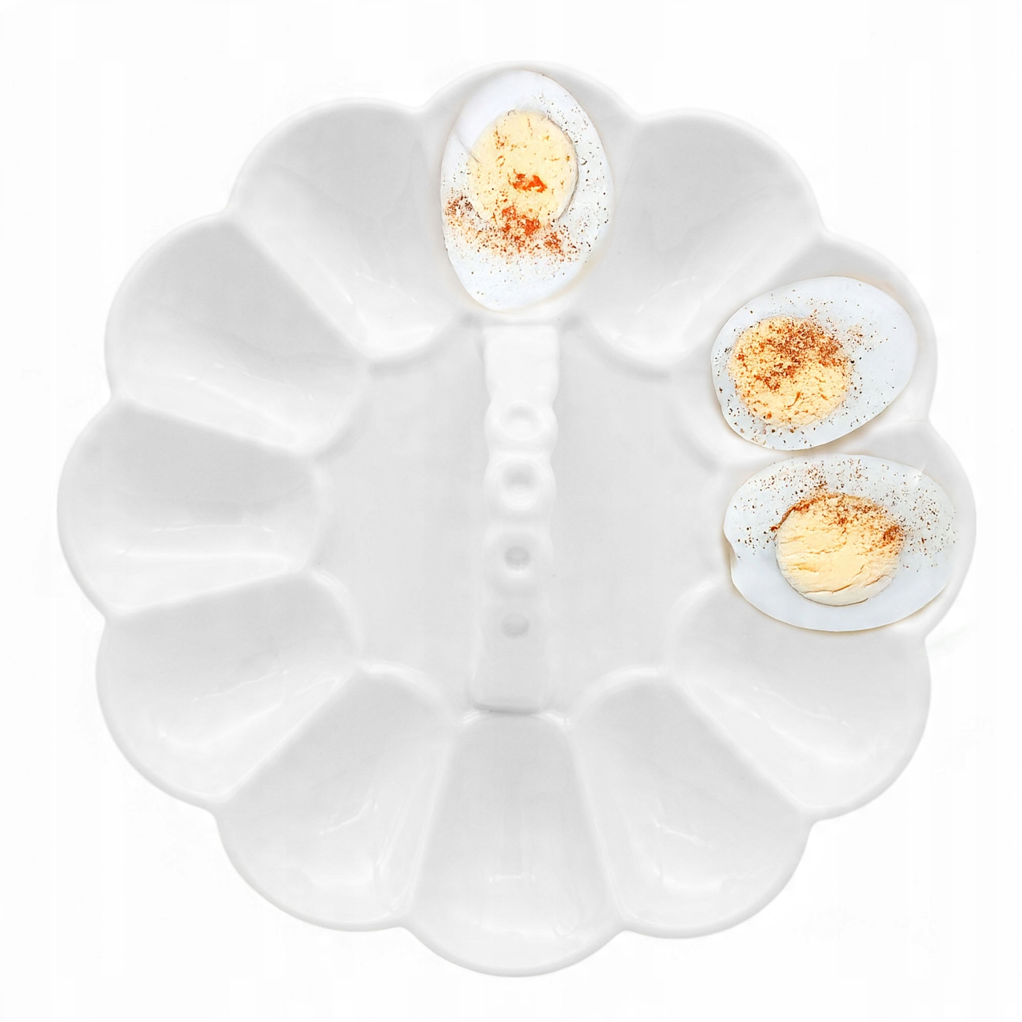 яєчна тарілка з ручкою - це практичне і естетичне блюдо для подачі варених яєць, як тверді, так і набита. Її плоска форма з порожнинами дозволяє стабільно розміщувати яйця, що полегшує їх введення та запобігає руху. У середині тарілки є зручна ручка , яка дозволяє безпечно переміщувати блюдо , і в той же час додає їй чарівність. Він виготовлений з порцеляни, що робить його довговічним і легко чистим. Завдяки елегантному дизайну та унікальним прикрасам тарілка чудово працює під час церемонії, таких як Великодні або сімейні вечері.