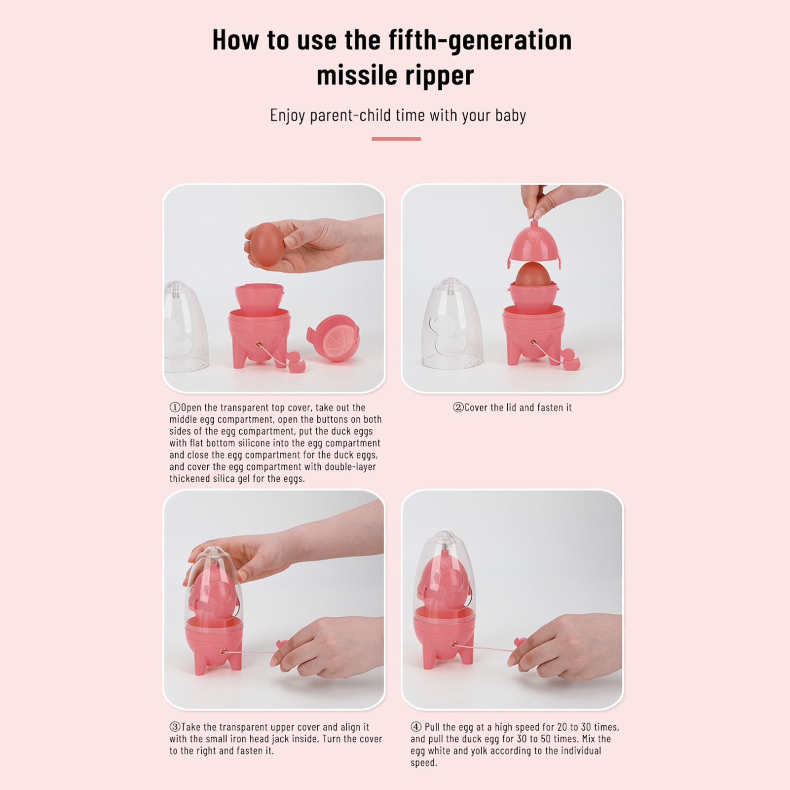 3. Проста робота: яєчна шкаралупа проста у використанні, просто покладіть яйце в машину, покладіть яйце на силіконову колодку, швидко витягніть мотузку, почніть обертатися і витягувати мотузку вперед і назад приблизно на секунду.