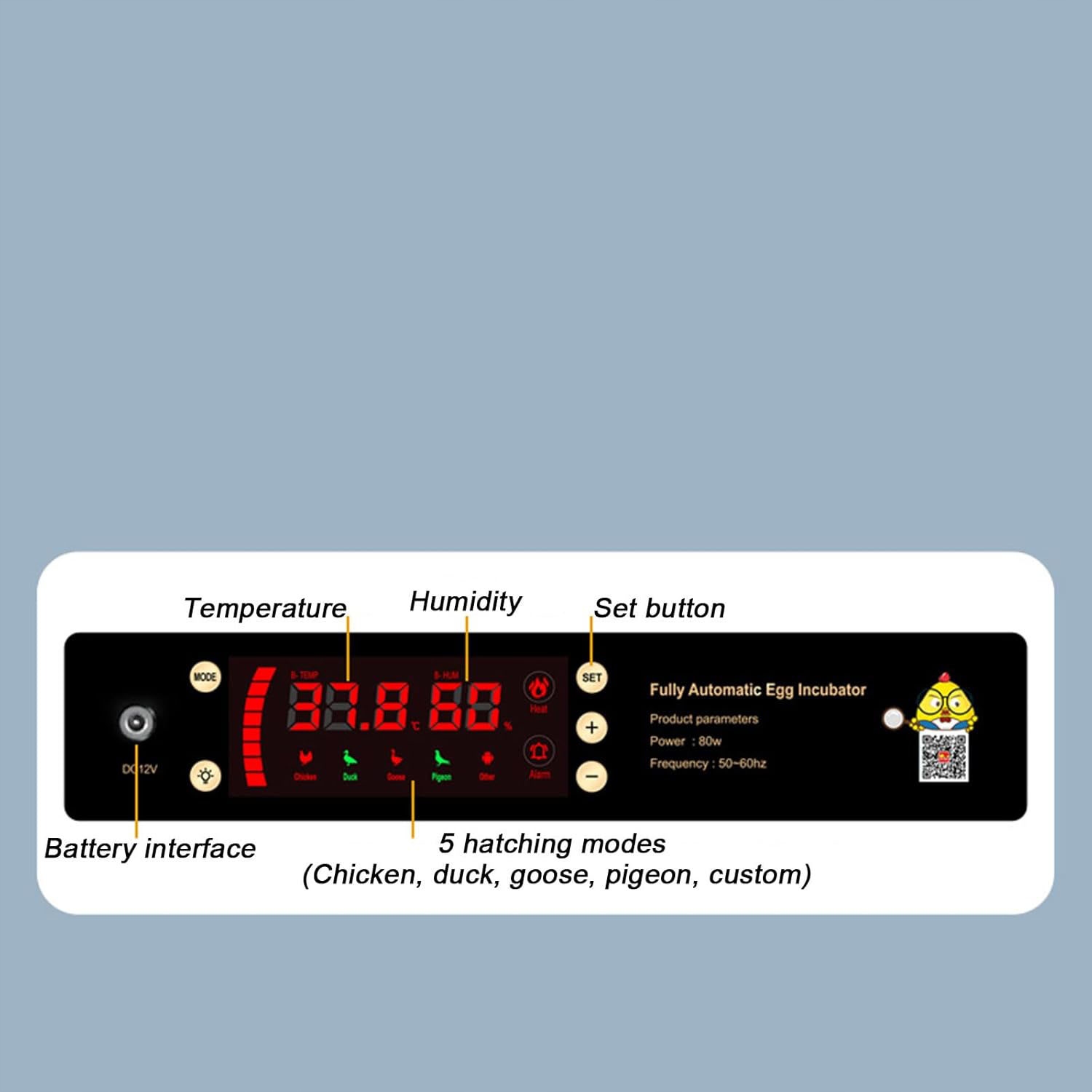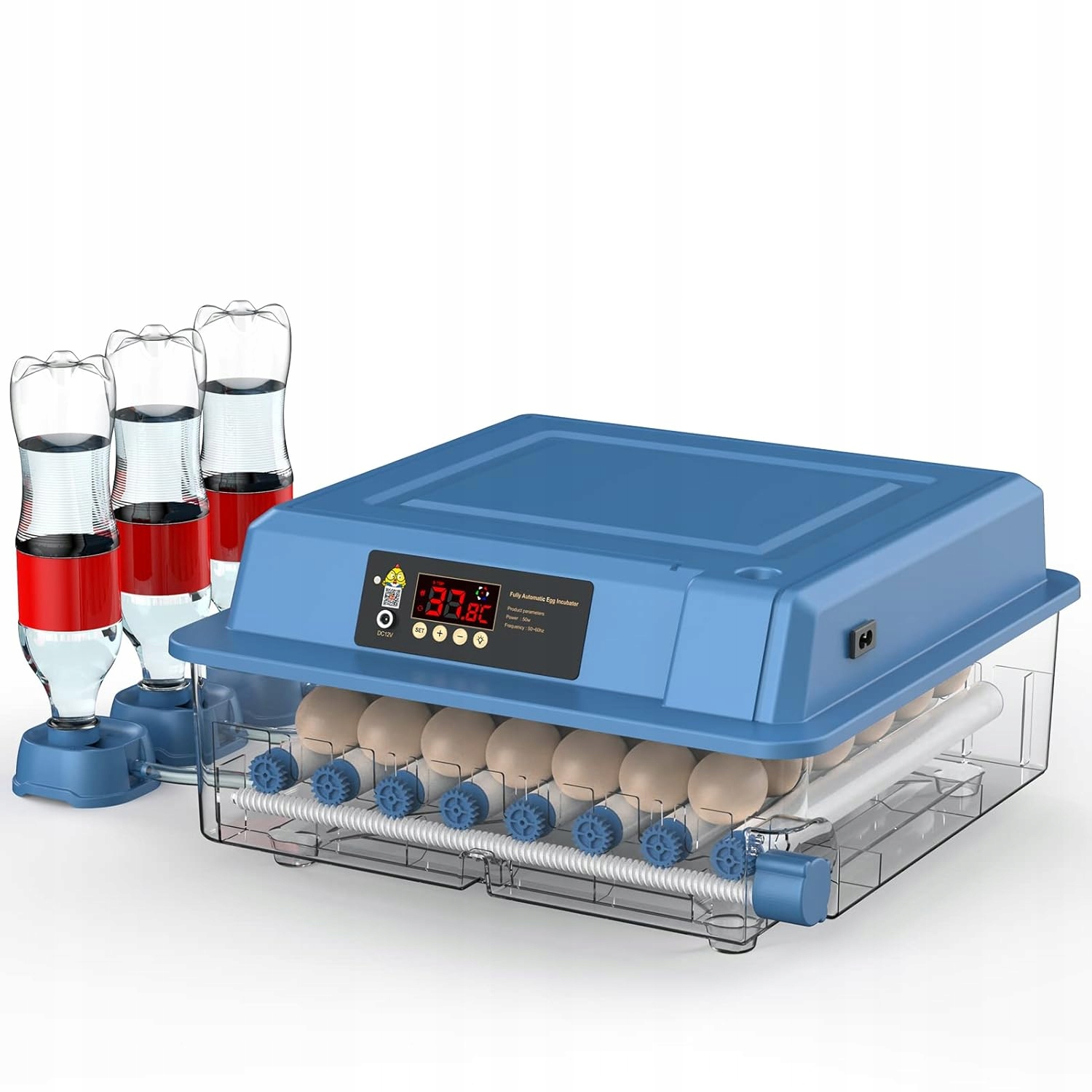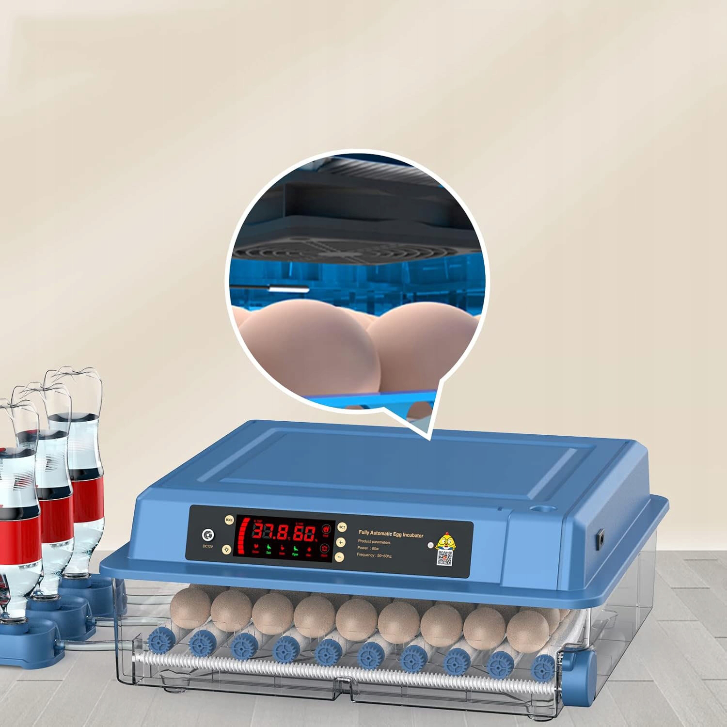 ✅ ✅ ✅ ✅ ✅ інкубаторний люк для яєць 64 шт. 80W - це автоматичний пристрій для інкубації курячих яєць, качок, гусака та інших видів птиці . Оснащений системою автоматичного обертання яєць, регулюванням вологості та світлодіодним дисплеєм з контролем температури, забезпечує оптимальні умови для ефективного вилуплення. Прозора обкладинка дозволяє спостерігати за процесом інкубації без відкриття пристрою. Інкубатор може працювати як від 230 В мереж, так і в надзвичайних ситуаціях з акумулятором 12 В.