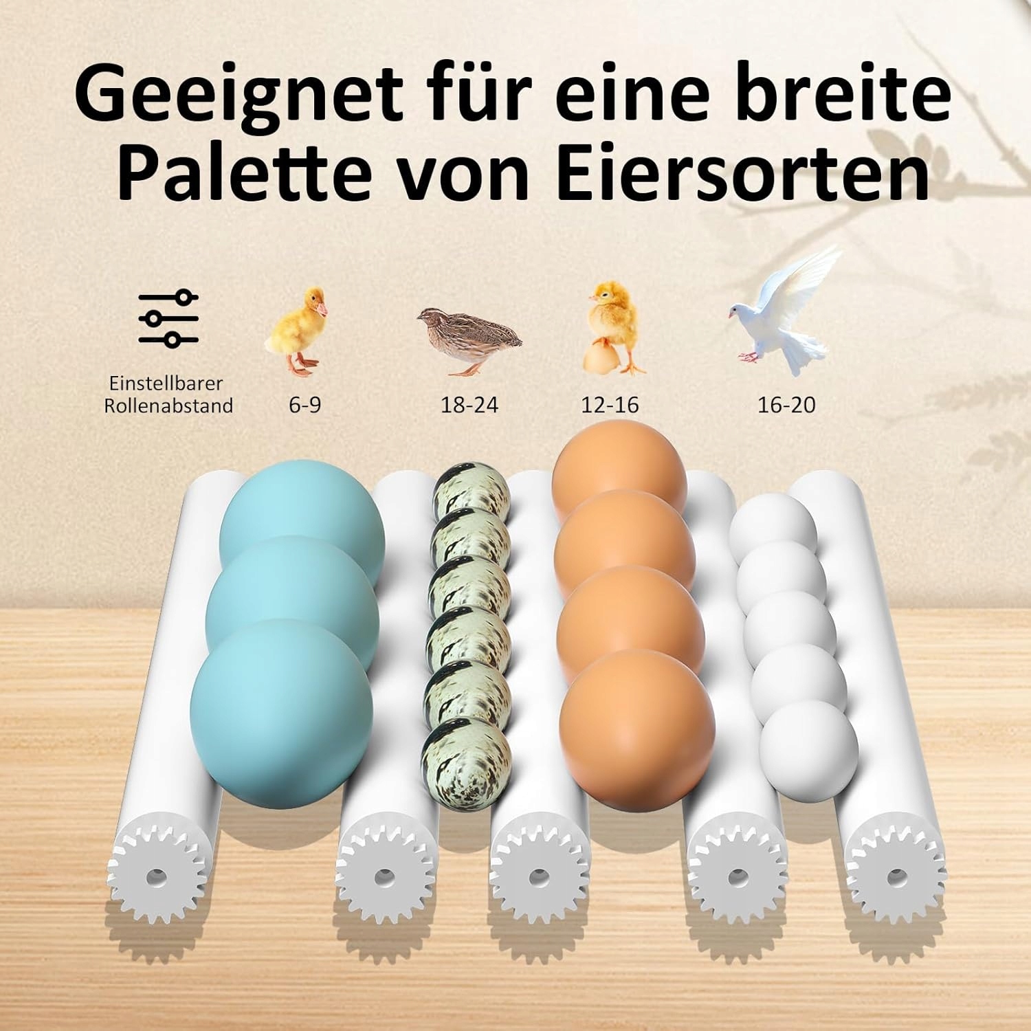 ✔ регульована відстань між яєчними шкаралупами. Відстань між роликами можна відрегулювати. Відстань між роликами може бути пристосована до розміру яєць, що розводиться по -різному. 4