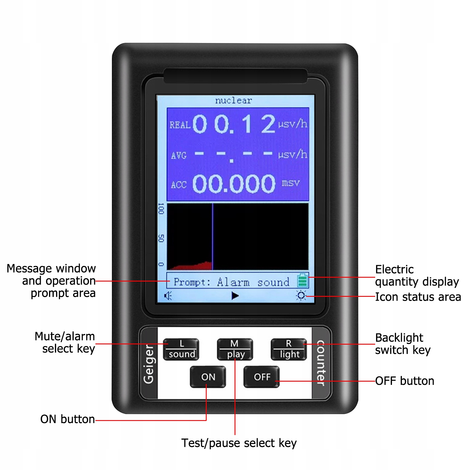 вбудований прецизійний датчик, після обробки контрольним мікрочіпом значення випромінювання може відображатися на чіткому цифровому РК-дисплеї.