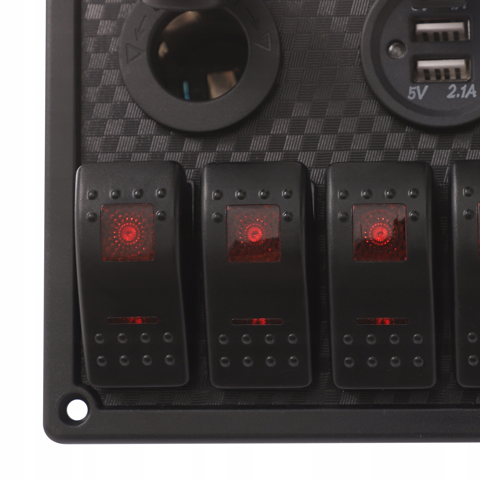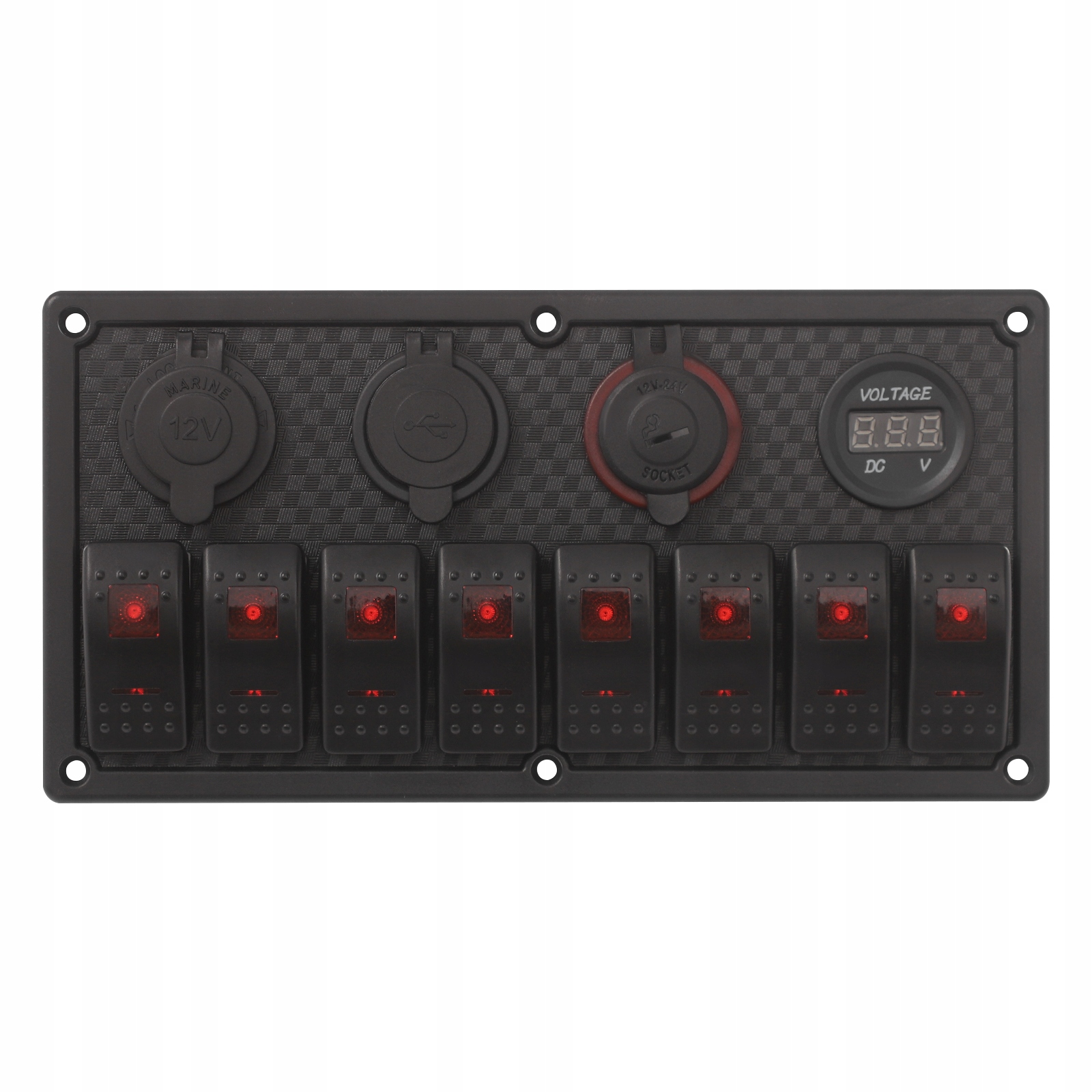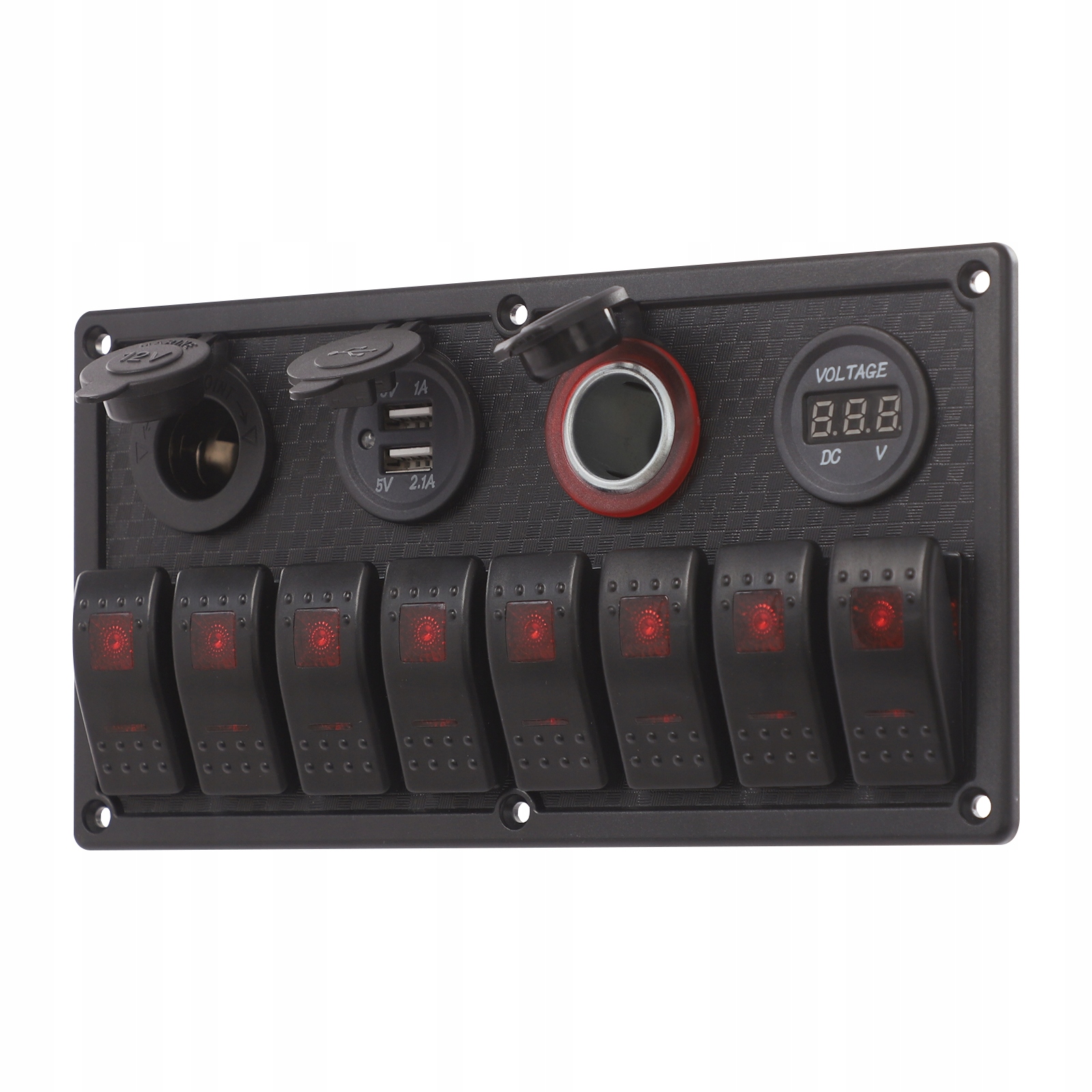 Ця 8-позиційна панель керування світлодіодним перемикачем для яхти є багатофункціональним рішенням для керування, спеціально розробленим для морських і транспортних засобів. Панель містить вольтметр, два USB-порти, гніздо для прикурювача та розетку змінного струму 12 В, що робить її сумісною з широким спектром потреб заряджання та живлення. Ця панель є ідеальним рішенням для людей, які хочуть підвищити функціональність свого автомобіля, зберігаючи при цьому чистий і стильний вигляд.