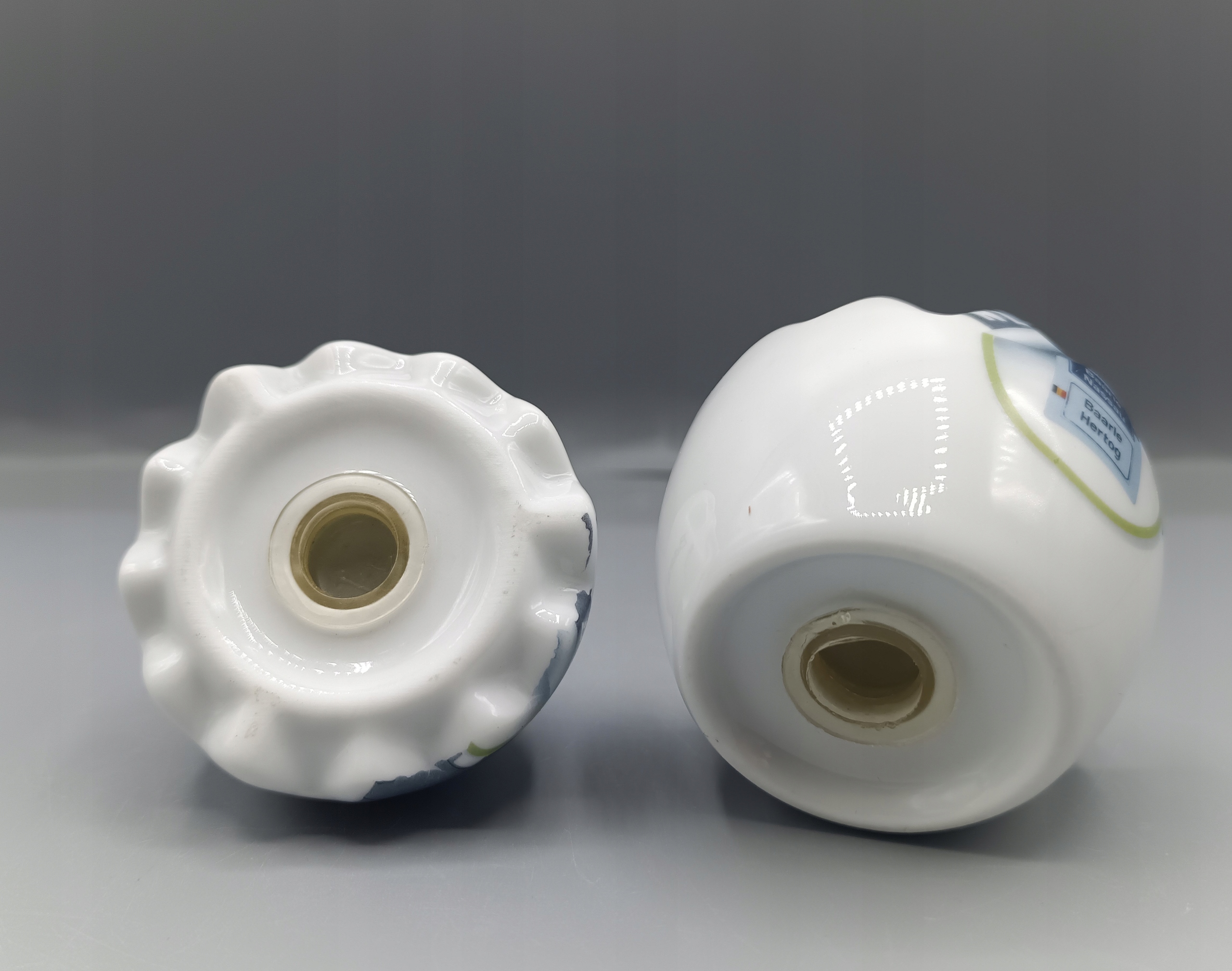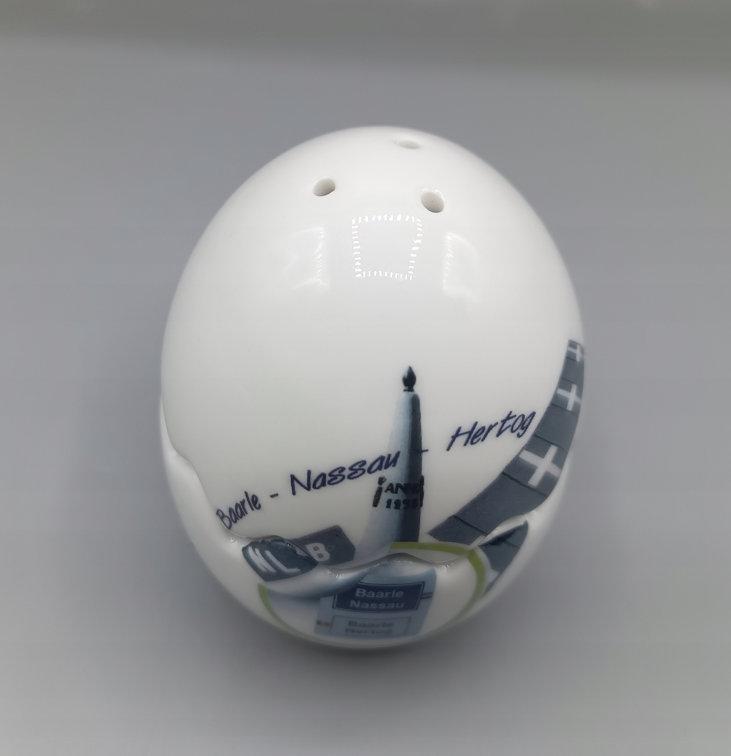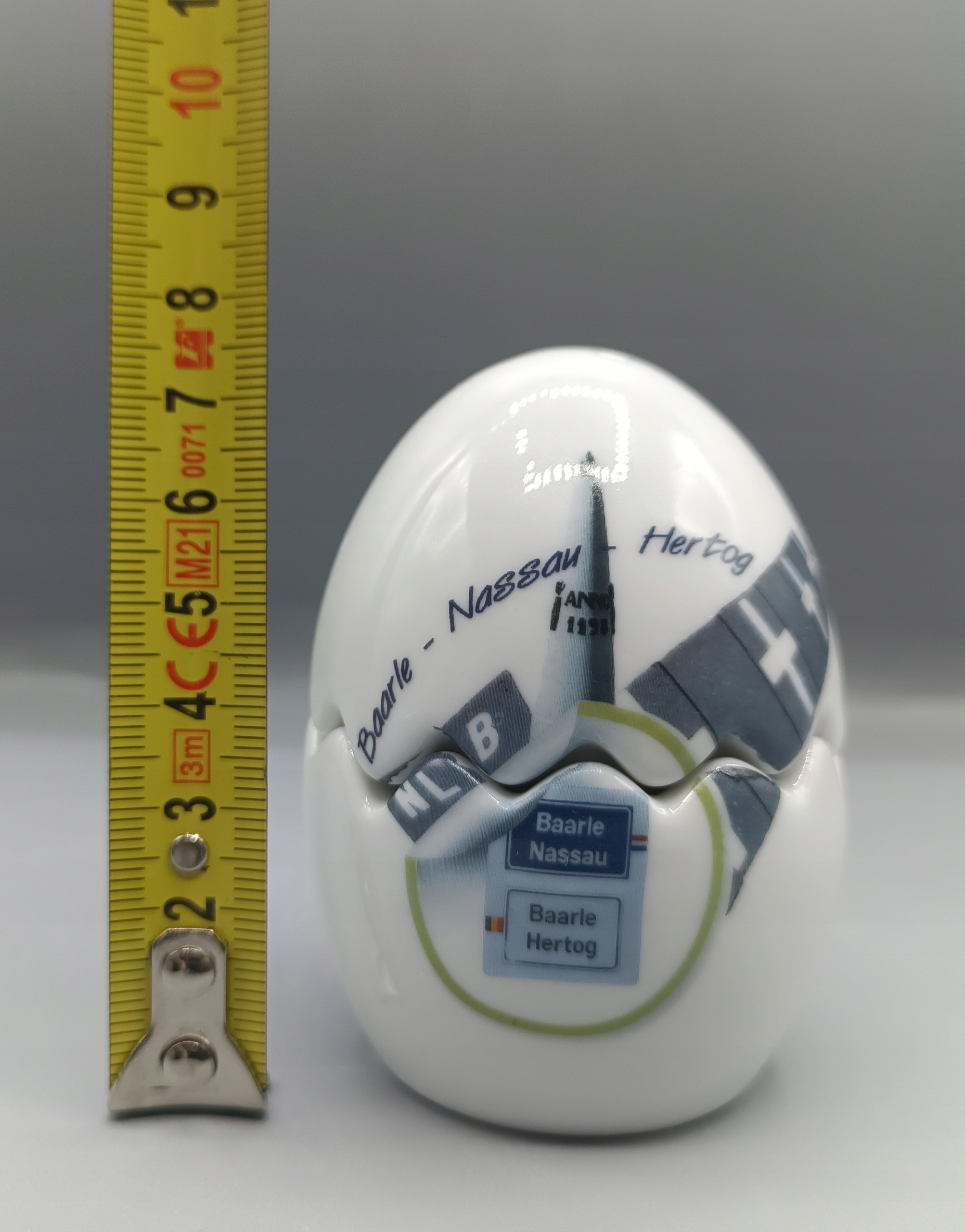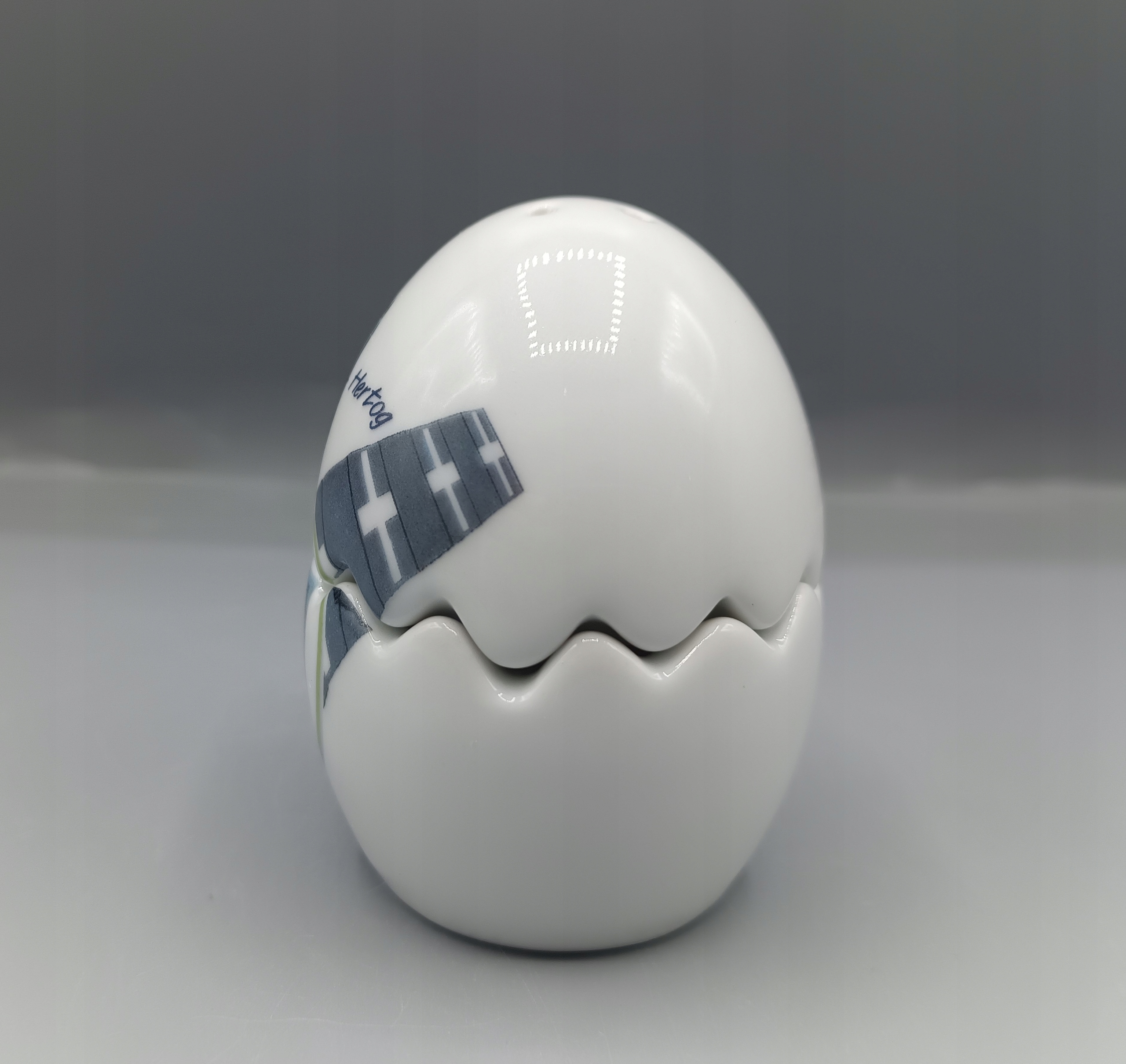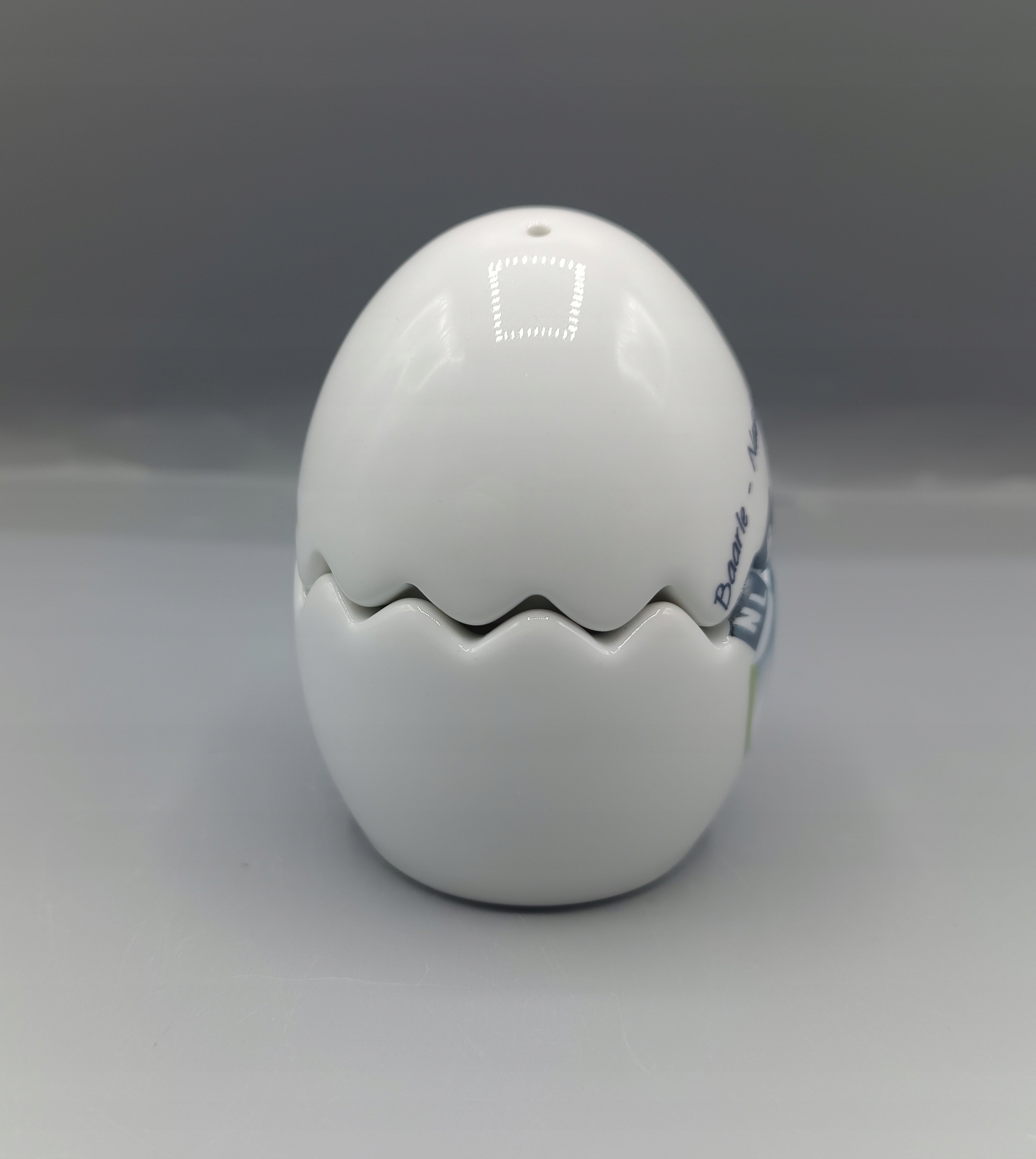 Порцеляна, пластикові пробки, на головках є 3 та 1 отвори, висота знесеного яйця 7,5 см, діаметр 5,6 см, вага 120г. Статуетка/сільничка виглядає так само гарно в житті, як і на фото. Предмет жодного разу не використовувався - звичайно корисний і колекційний. РЕКОМЕНДУЮ!