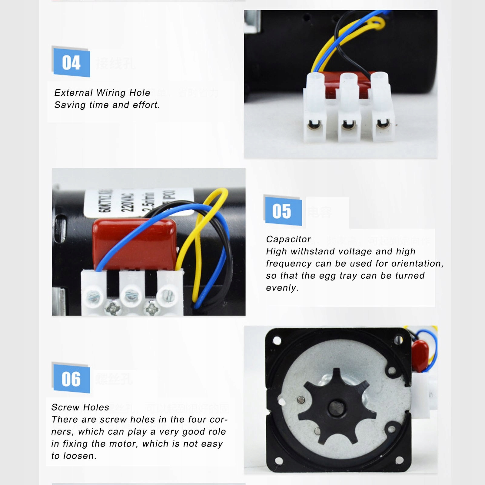 2. [Простий у використанні] - внутрішній отвір проводки економить час і зусилля. Конденсатор має високу тривалість і високу частоту, а спрямований ефект змушує лоток яєць рівномірно обертатися.