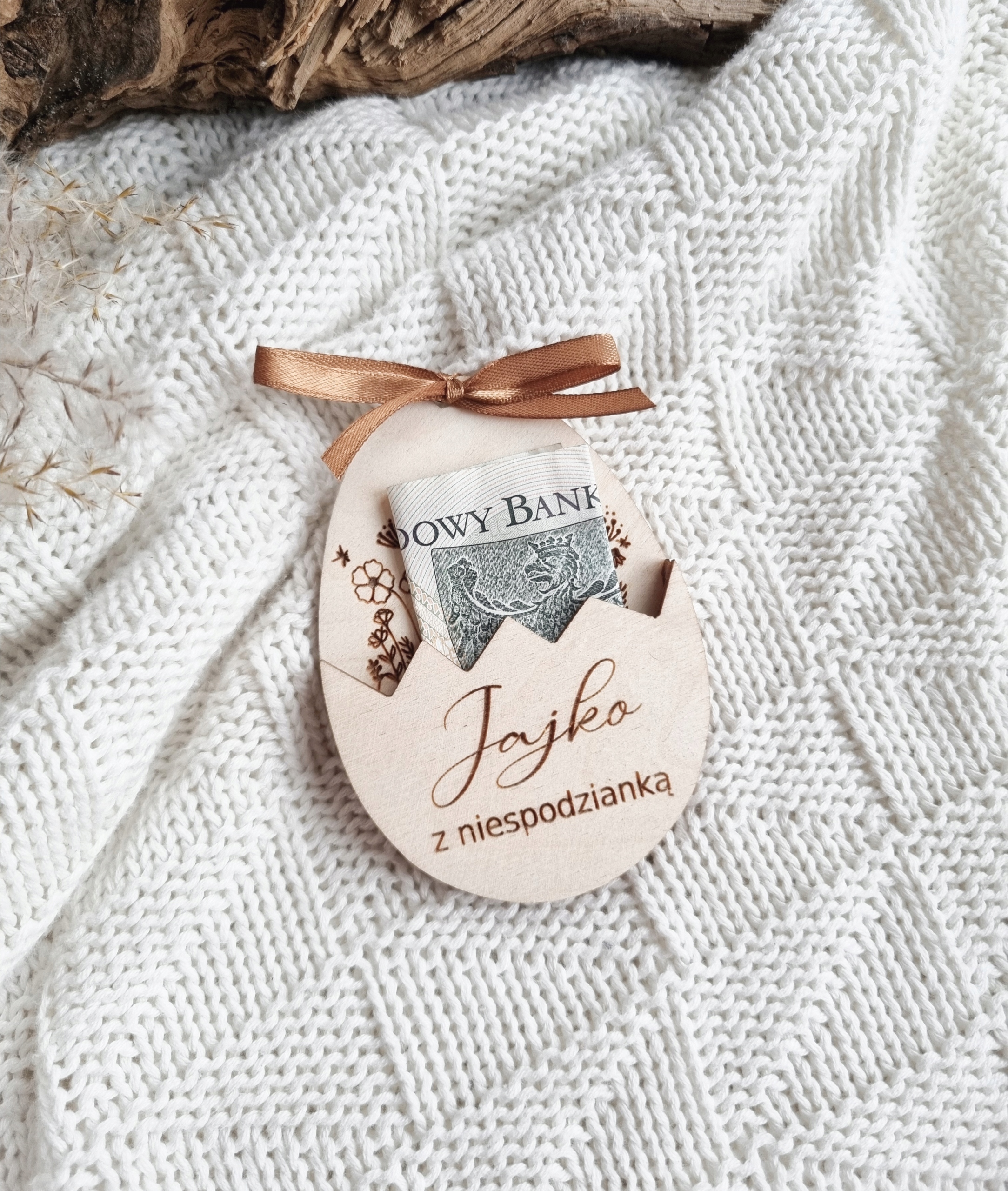 Яйце кольору натурального дерева з елементами гравіювання.