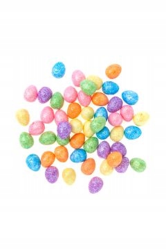 Кількість яєць в упаковці: 50 шт. Розмір одного яйця: 1,8 см Кольори: рожевий, блакитний, жовтий, помаранчевий, фіолетовий і аквамарин Особливості: покриті райдужними блискітками