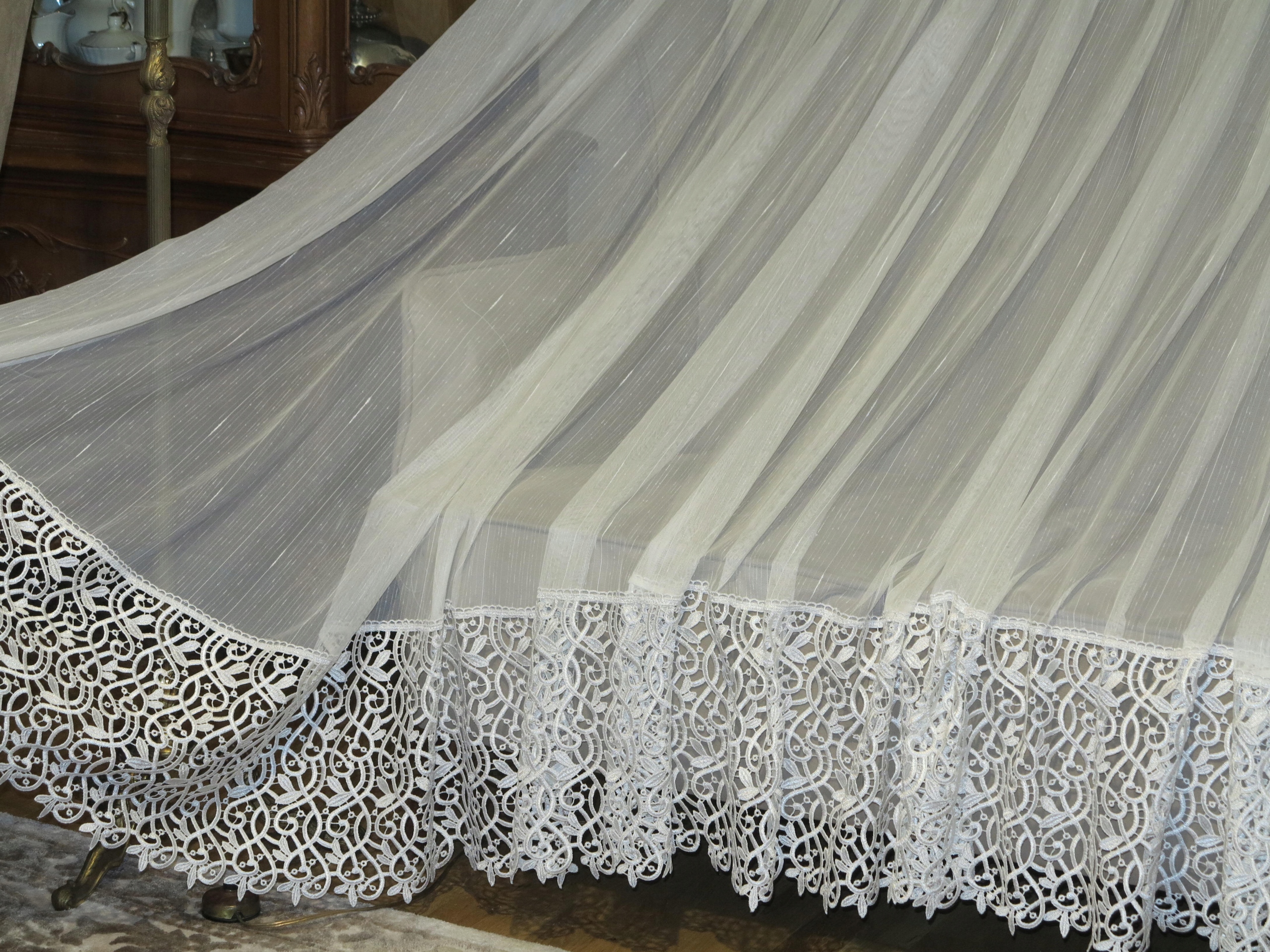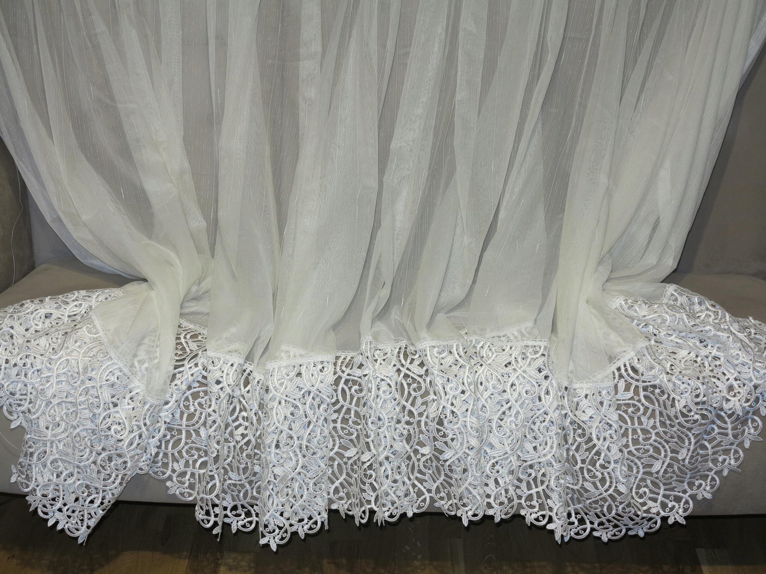 ЧУДОВУ ШТОРУ, ДЕКОРАТИВНО РОЗРІЗАНУ В БАНТИК. НИЗ ЩІЛИЙ ПЕРЛОВИЙ ГІПЮР. КОЛІР СВІТЛОГО ЕКРЮ