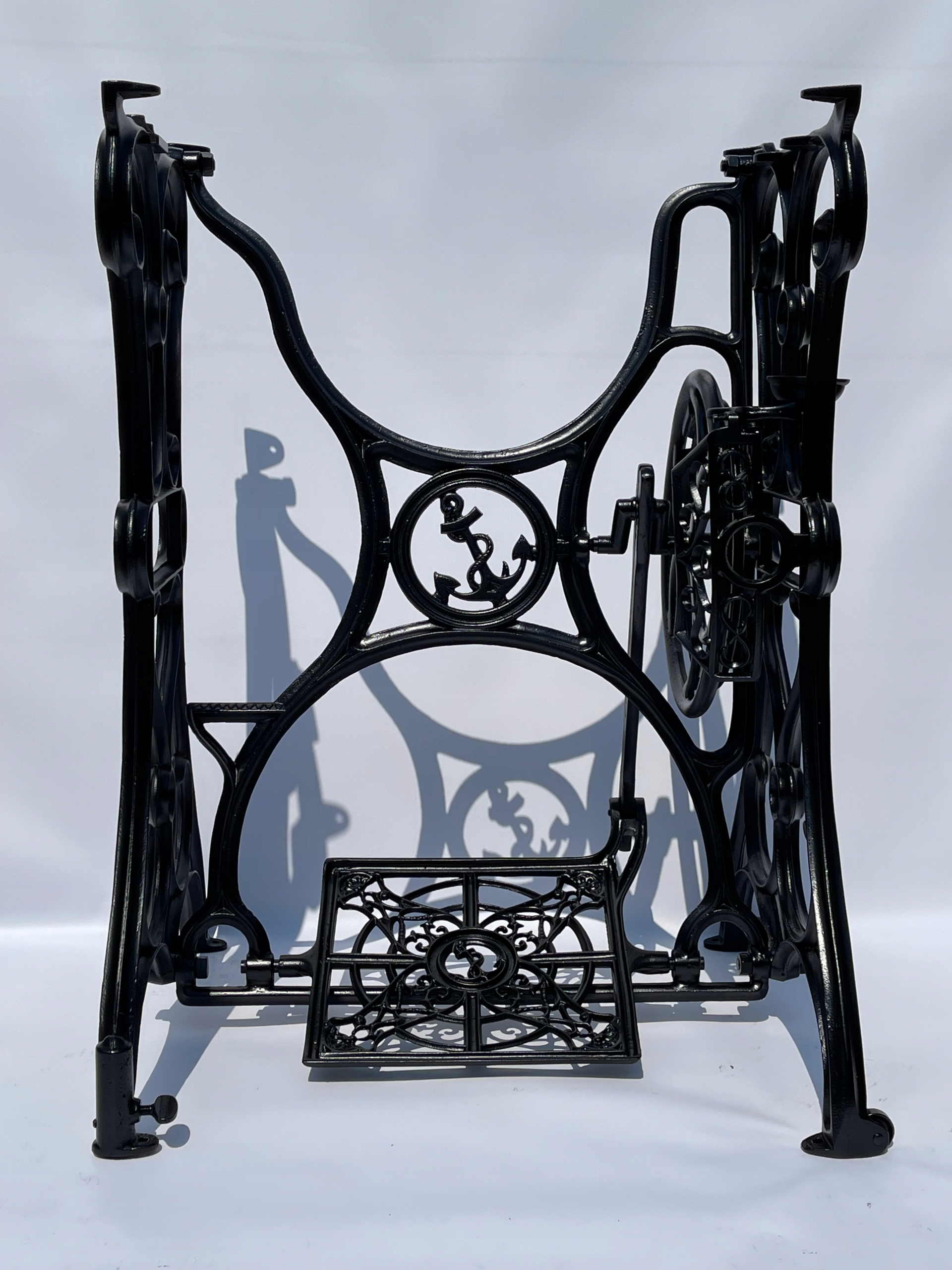 Предмет продажу стара чавунна основа від швейної машинки KOHLER. Дуже гарно оформлений малюнок з якорем посередині та в педалі приводу. Рідше - єдиний екземпляр такого роду на Allegro. Все важче знайти стіл з таким багатим декором. Він має всі 3 колеса внизу та одну з регульованих по висоті ніжок. Це полегшує встановлення на нерівній підлозі.
