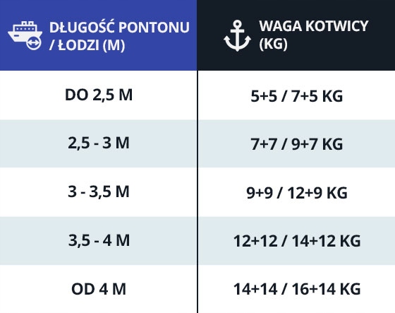 Для стабільної фіксації/закріплення судна найкраще використовувати 2 якорі/вантажі одночасно (на носі та на кормі). Не менш важливим є вибір відповідної ваги якоря залежно від довжини судна - таблиця збоку