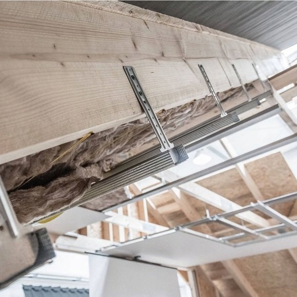- Анкерний підвіс — це сполучна ланка між кроквою та стельовим профілем CD. Використовується для монтажу та вирівнювання профілів CD60 на горищах та конструкціях покрівлі, до яких кріпляться облицювання з гіпсокартону.