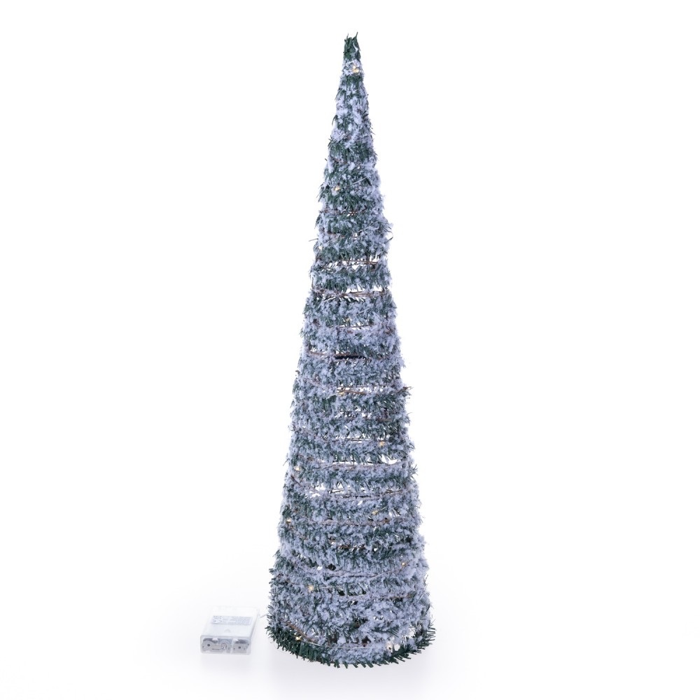 Конус з металу, прикрашений зеленими засніженими гілками. Плетіння виглядає унікально, а в поєднанні з 30 світлодіодними лампами композиції привернуть увагу та захоплять. Жовте тепле світло дарує атмосферу та затишок.
