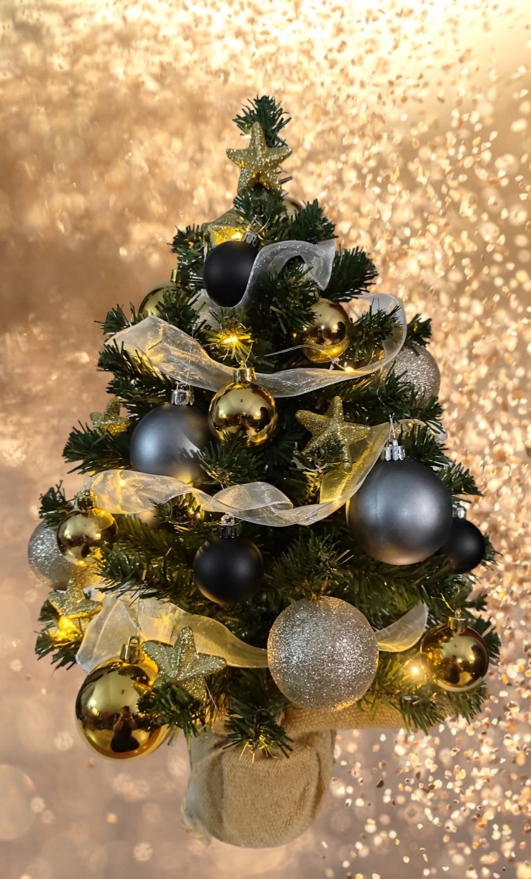 Ялинка маленька 50 см з декораціями, ДЕКОРАЦІЇ, золота, чорна, готова, вбрана, LED, ХІТ