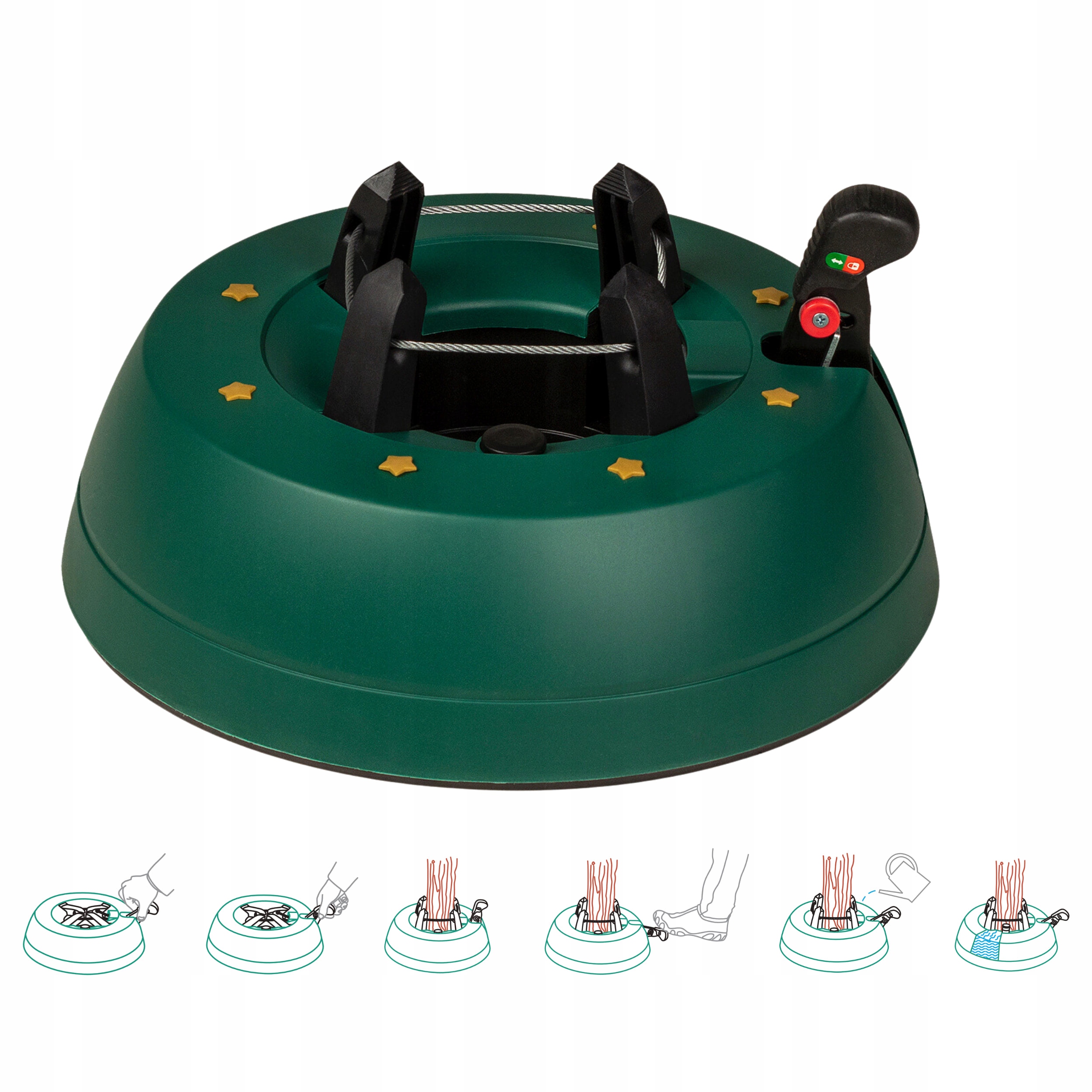Міцна підставка для живих ялинок. Вам не доведеться завантажувати його (наприклад, з камінням) або прикріпити ялинку до радіатора, щоб він не підтримував. Крім того, ви можете залити в нього до 2 літрів води, що спричиняє вантаж 2 кг. Система 4 гачка стискає багажник ялинки і повністю іммобілізує його. Завдяки запатентованим механізмам, ялинка стоїть прямо і не перепадає. Гачки вловлять і стискають багажник діаметром від 3 до 11 см (тобто всі найпопулярніші типи дерев) і, таким чином, повністю іммобілізуючи ялинку вертикально. Таким чином, вам не потрібні інструменти для трубки та регулювання багажника. Деталі: Золоті зірки для верхньої частини корпусу