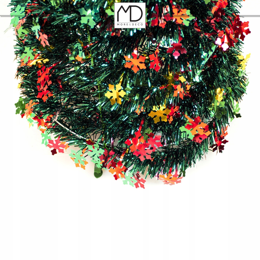 Різнобарвні сніжинки чудово контрастують із глибокою зеленню гілок, створюючи класичний різдвяний ефект, який підходить як для сучасних квартир, так і для традиційних будинків.