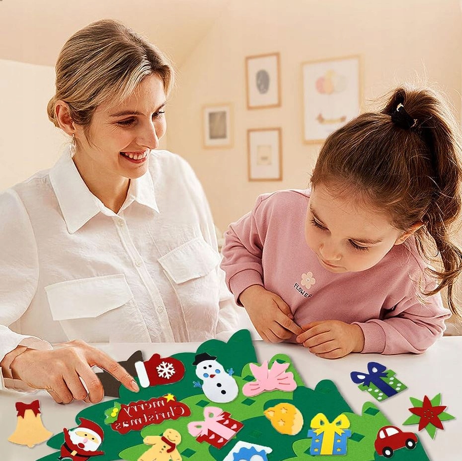 ▶ Ялинка з фетру дозволяє дітям створювати власні новорічні композиції. Різнокольорові прикраси різних форм — від подарунків до зірок і сніговиків — можна вільно прикріплювати та змінювати, розвиваючи уяву та ручні навички.