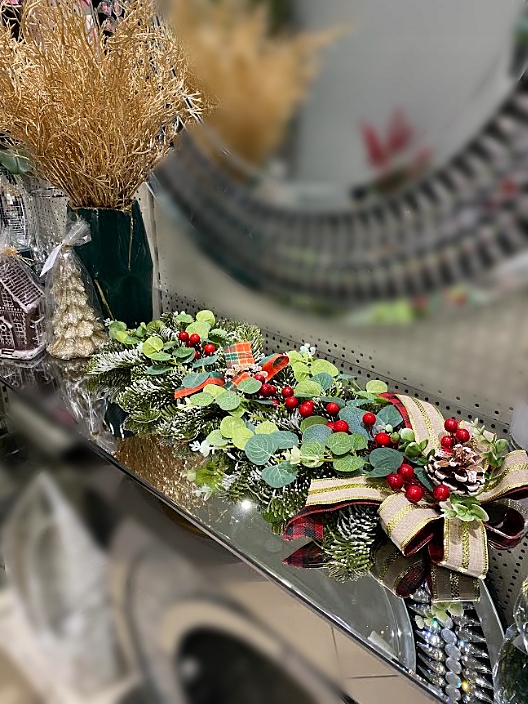 - Основа: прикраса базується на міцній зеленій основі з ялинових гілок, які додають свіжості та довговічності.