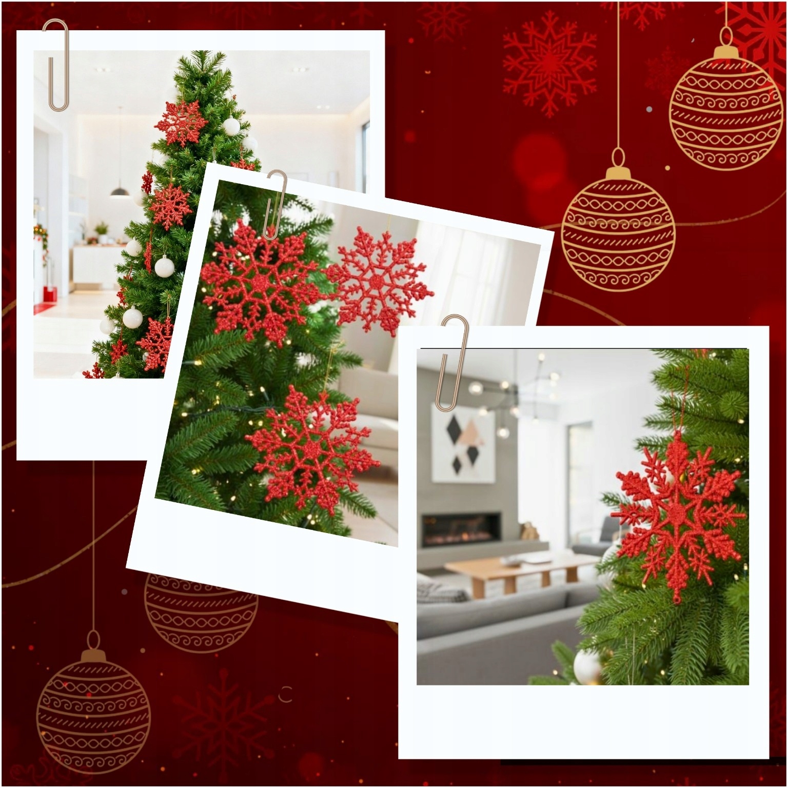ЯЛИНКОВІ КУЛІ ЯЛИНКА ПІДВІСИ ЧЕРВОНІ СНІЖИНКИ ПРИКРАСИ x12 БЛИСКОК