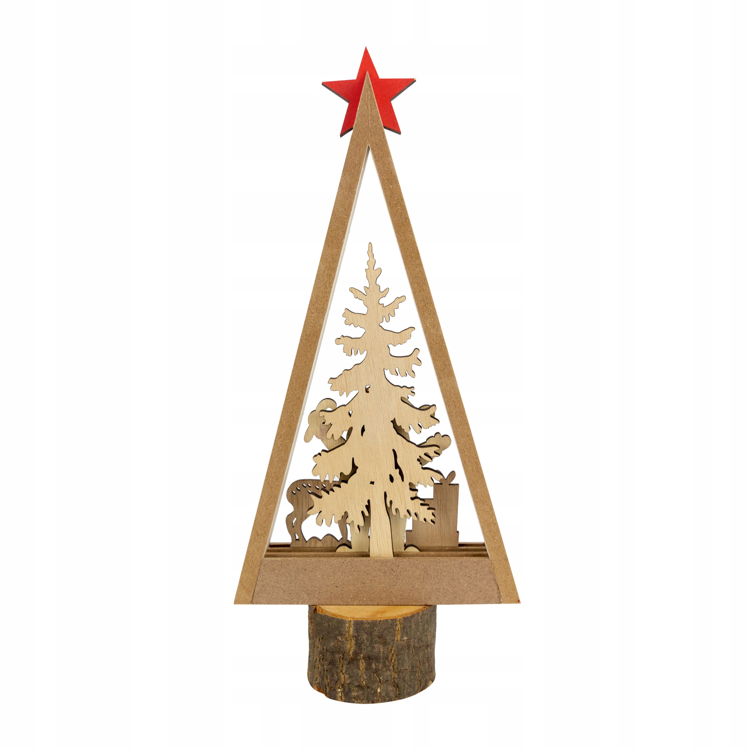 Ялинка висотою 34 см, виготовлена повністю з дерева. Всередині ялинки є тривимірна різдвяна ілюстрація, на якій зображено маленьку ялинку, Санта-Клауса, оленя, подарунки та напис X-mas, а також червону зірку на самому верху.