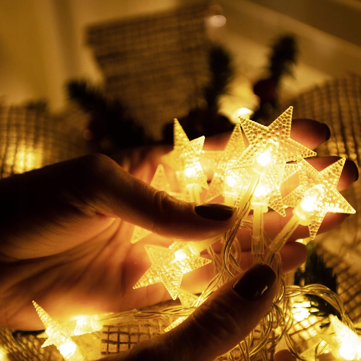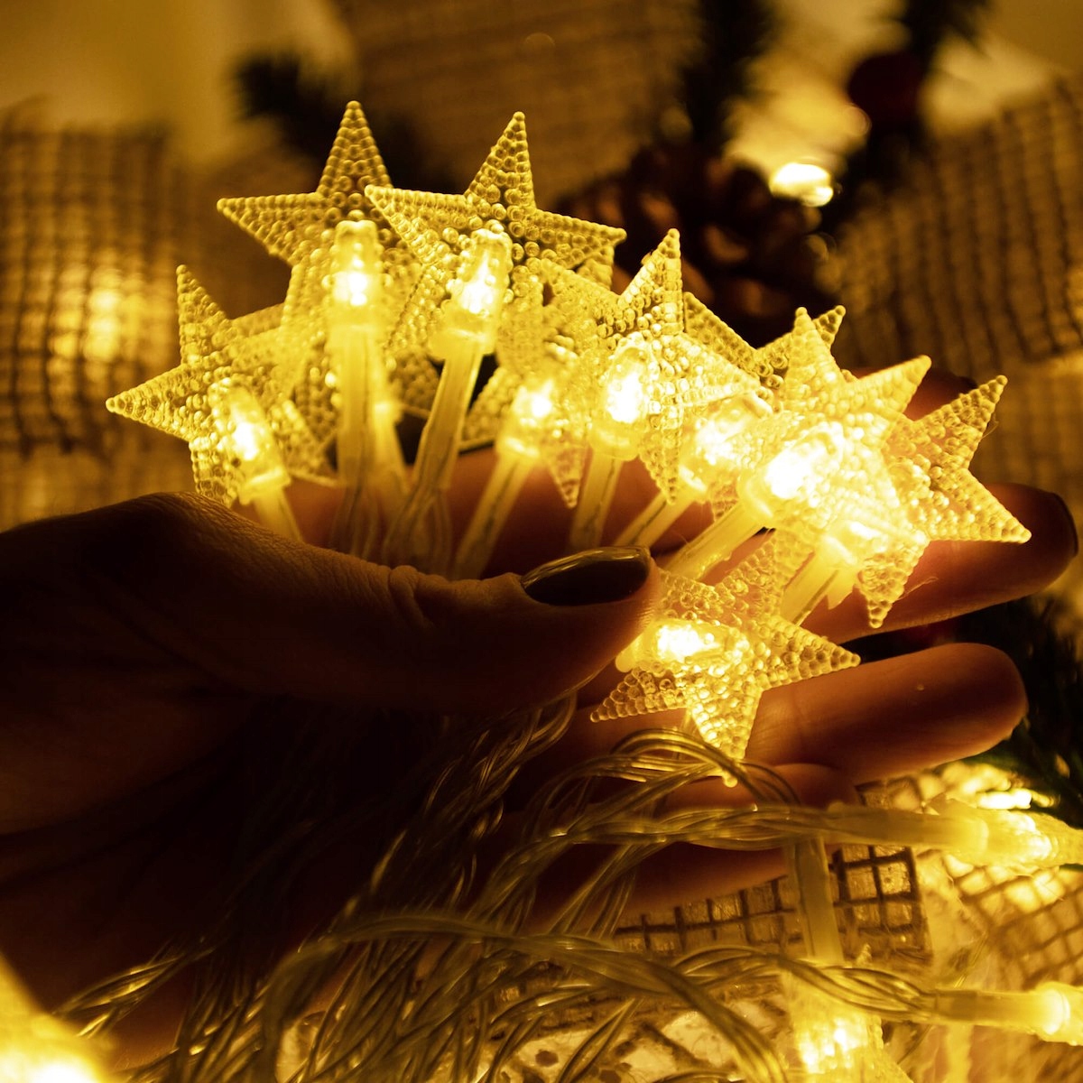 Ялинкові вогні складаються зсвітлодіодів у формі милих зірочок, які мають розміри: 3,5x3,5 см. Колір світла яскравий і дуже виразний. Увесь пристрій живиться від акумулятора, тож ви можете повісити його де завгодно, не турбуючись про те, чи є поблизу розетка.