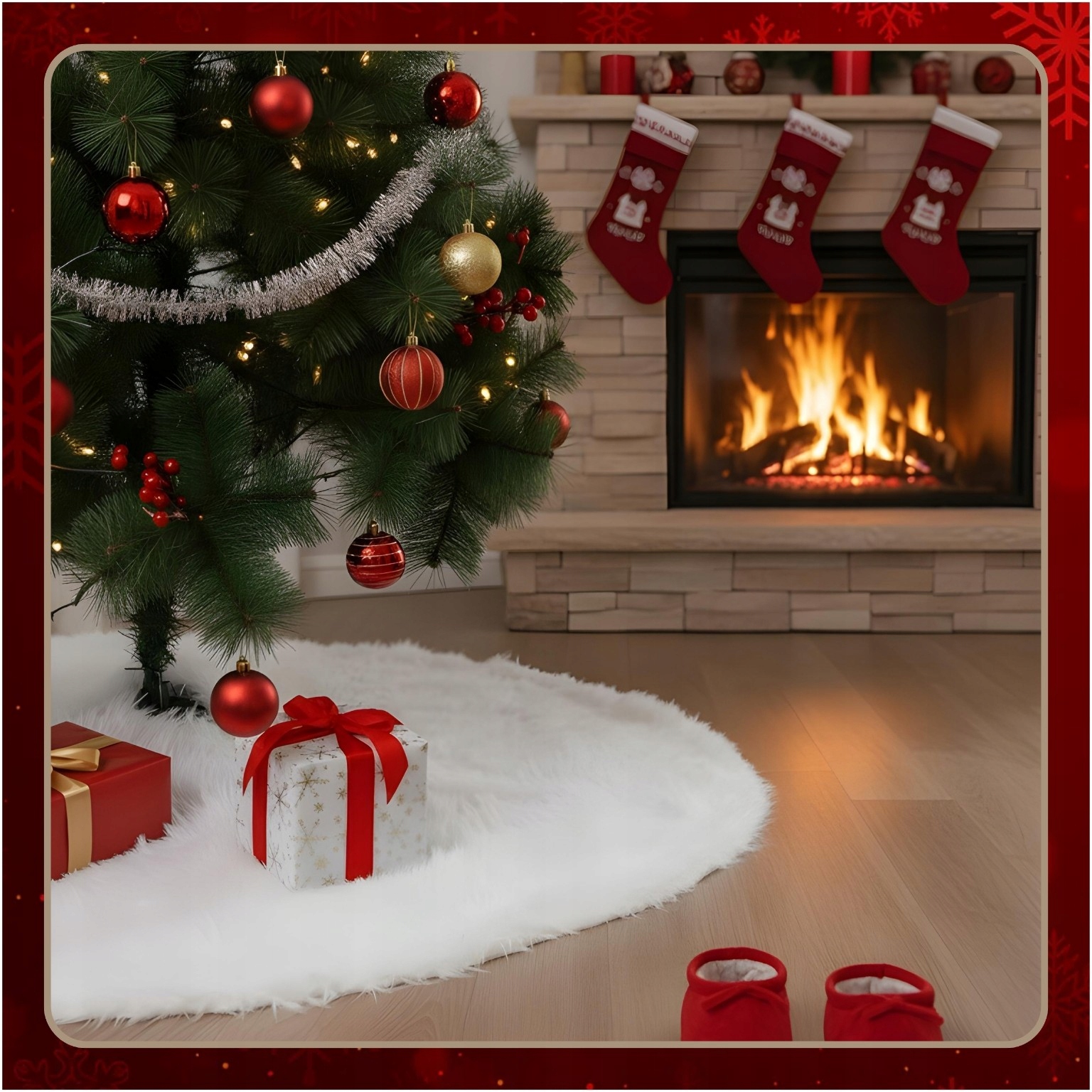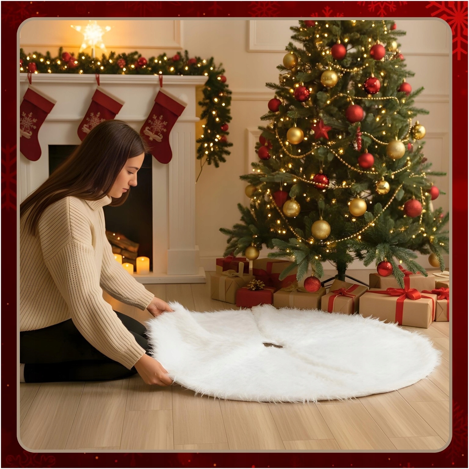✔️ Під ялинку у вітальні чи вітальні М'яке хутро та елегантний білий колір додадуть інтер'єру різдвяної атмосфери та затишку, а неслизький низ забезпечить стійкість навіть на гладкій підлозі.