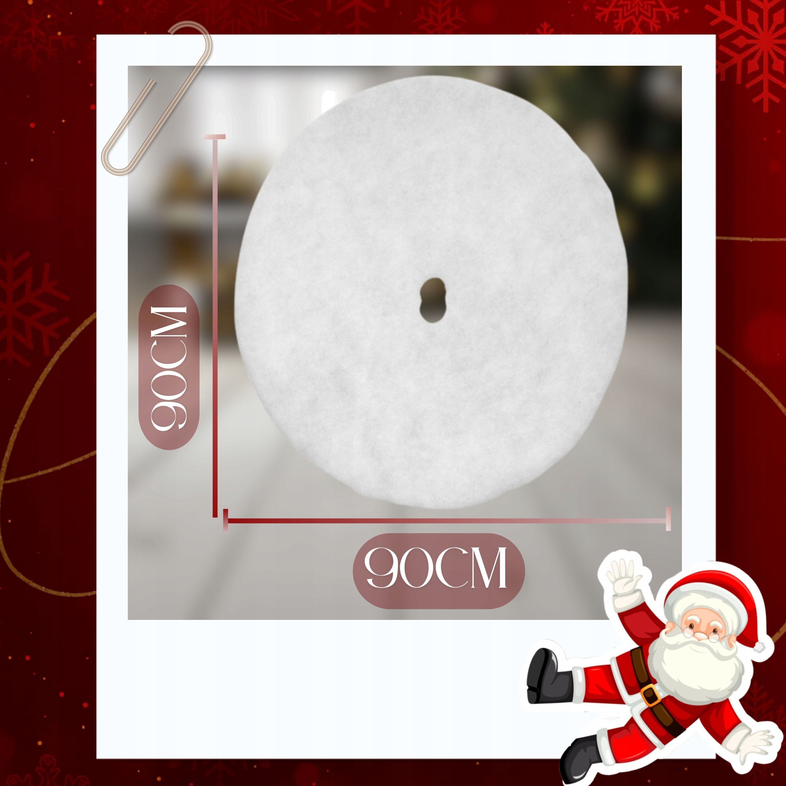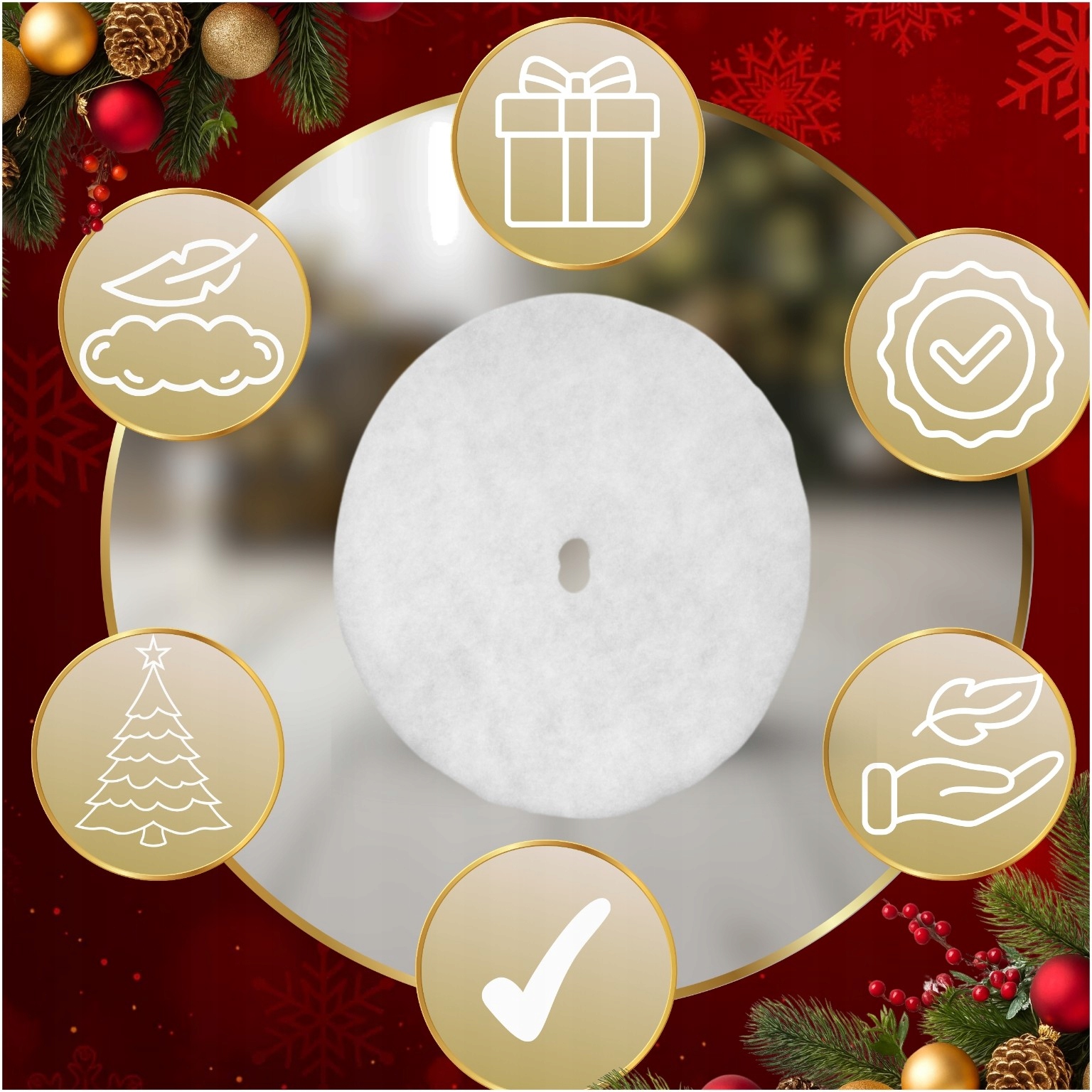 ✅ Діаметр: 90 см ✅ Форма: Кругла ✅ Колір: Білий ✅ Матеріал: М'яке штучне хутро (поліестер) ✅ Застібка: Липучка/зав'язка (легко встановити під ялинку) ✅ Призначення: Ялинкова прикраса, подарунковий килимок ✅ Прибирання: Ручне прання або делікатне прання при низькій температурі ✅ Вага: Близько 250 г ✅ Стиль: Сучасний, святковий, елегантний