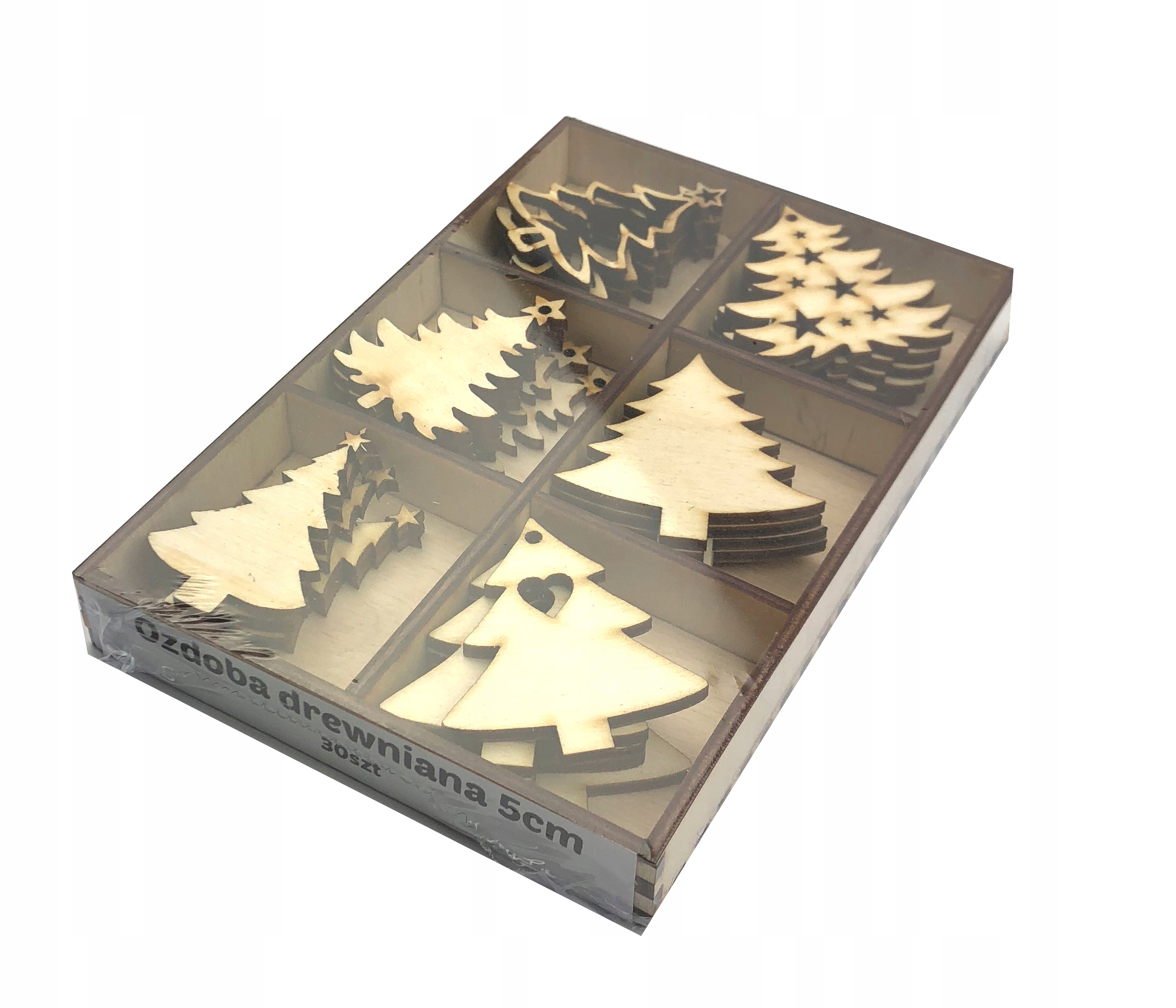 Досконало виготовлені дерев'яні ялинкові прикраси висотою 5 см, виготовлені з екологічного матеріалу, такого як дерево (фанера).