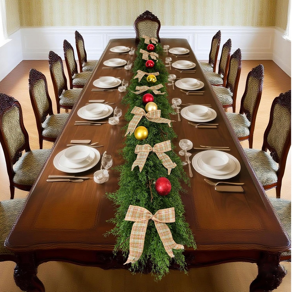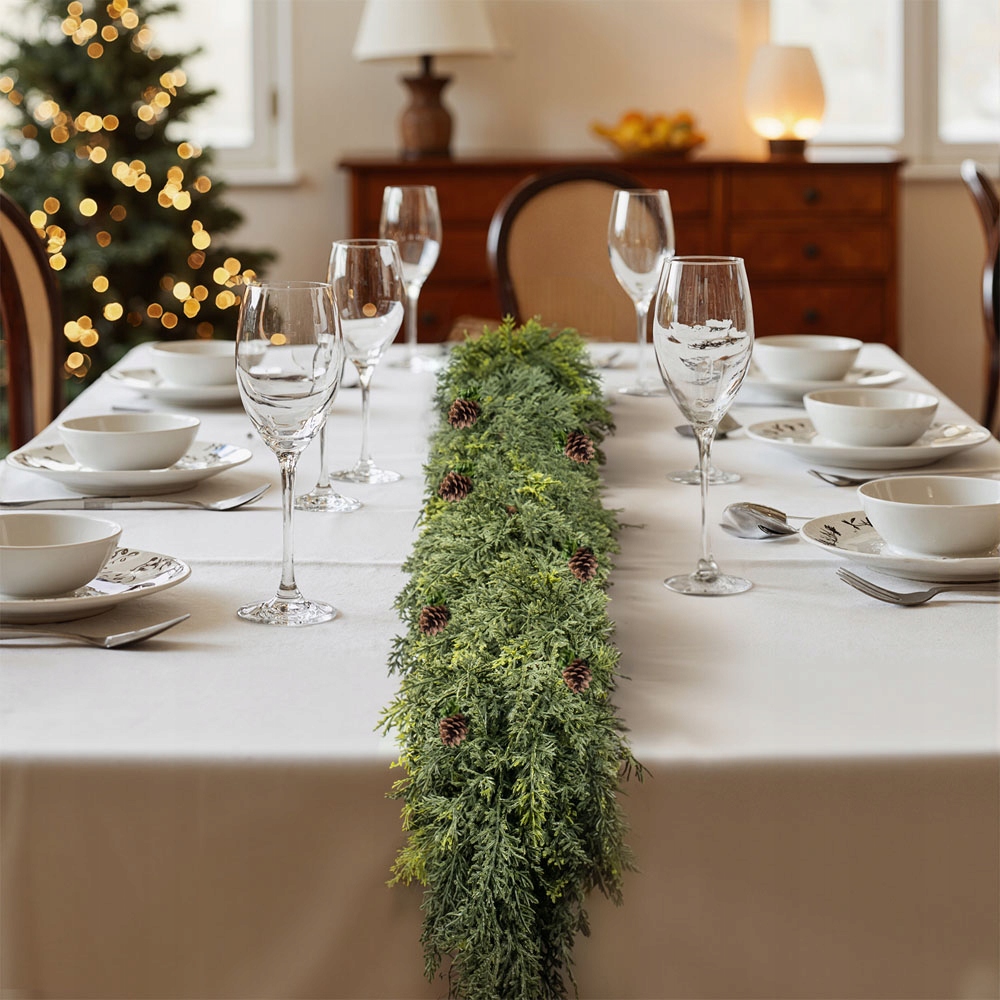 Вінок довжиною 1,8 метра та шириною 10 дюймів виглядає ефектно та природно. Завдяки ніжним, гнучким гілочкам і прикрасам у вигляді соснових шишок, червоних ягід і дзвіночків він принесе чарівну, святкову атмосферу у ваш дім. Ідеально підходить не лише до Різдва, а й як осінньо-зимовий стіл.