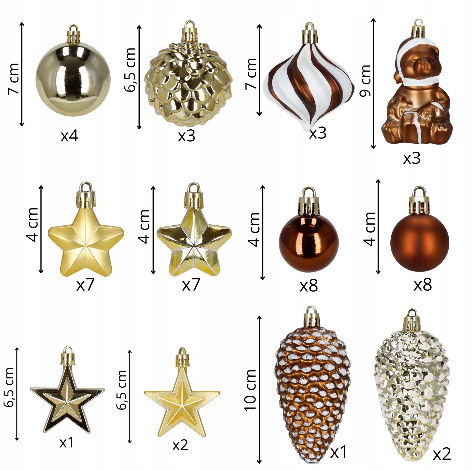Ялинкові кульки, які пропонуються в рамках пропозиції, дуже схожі на скляні. Завдяки гладкій дзеркальній поверхні та блискучому покриттю вони фантастично відбивають світло, підсилюючи ефект блискучих і мерехтливих прикрас, які викликають у пам’яті асоціації з морозним і сніжним зимовим пейзажем.