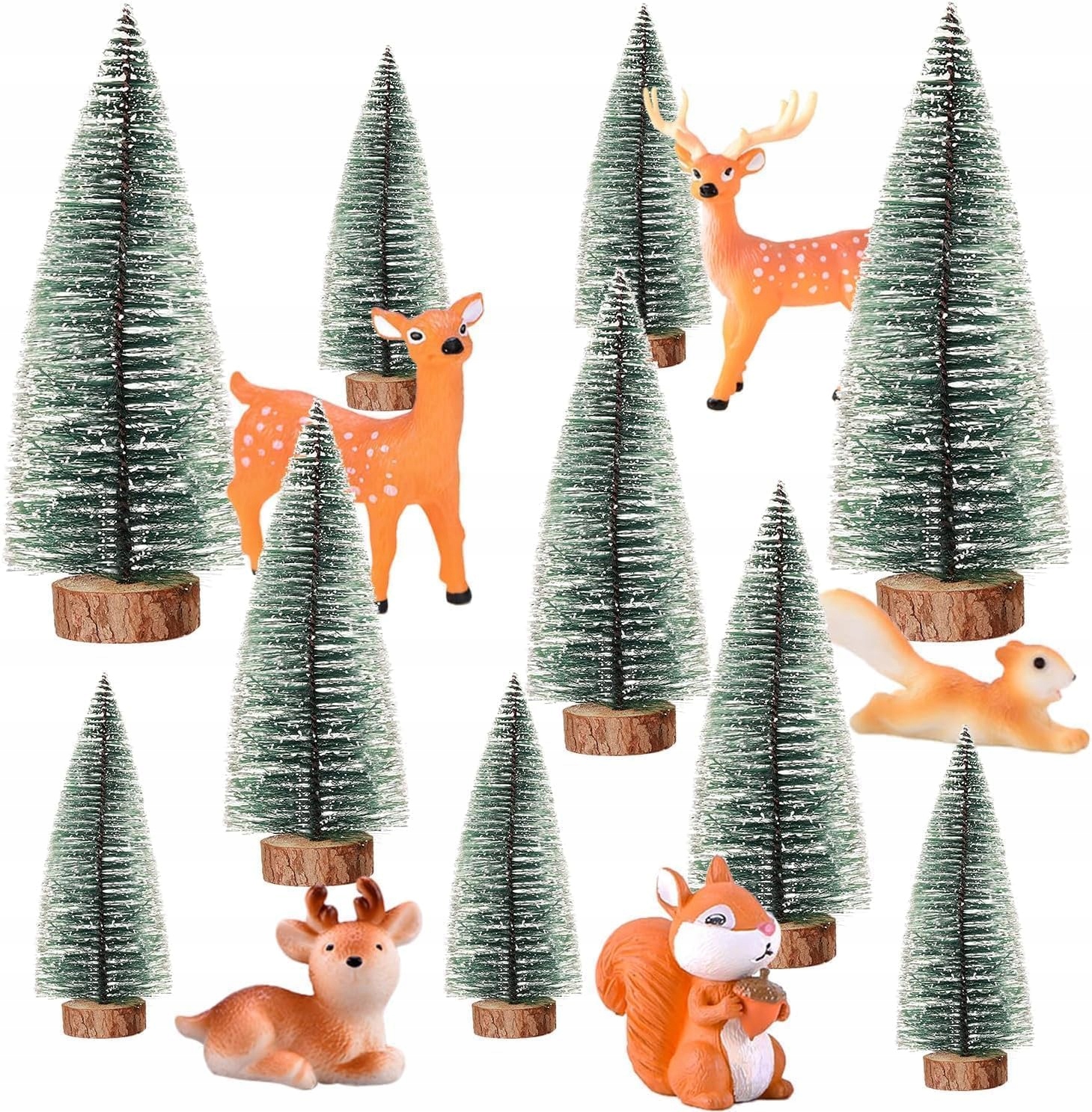 - 3 різних розміру: 10 штук ялинок, розмір: 10 см х 5; 15 см х 3; У набір входить 5 маленьких прикрас тварин, 3* оленя та 2* білки. Ці засніжені ялинки підійдуть для будь-якої невеликої виставки, особливо для зими та майбутніх свят, взимку вони створюють для вас гарний мініліс.