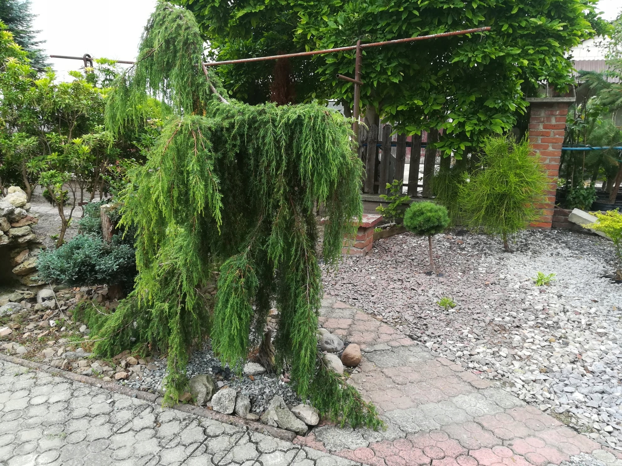 Надзвичайно мальовничий, плакучий сорт ялівцю, здалеку нагадує низький кипарис нутка 'Pendula', але набагато менше вимогливий, стійкий до посухи та низьких температур. Рослини утворюють оригінальні широкі кущі зі звисаючими пагонами. У віці 10 років вони виростають до 1,5-2 метрів у висоту і такої ж ширини. Від головного пагона відходять горизонтально розташовані бічні пагони. Зростаючі на них гілочки, а також кінці пагонів звисають, завдяки чому рослини набувають мальовничих обрисів, здалеку нагадуючи таємничих казкових героїв. З віком нижні гілки елегантно, майже велично піднімаються вгору, додаючи кущам шарму. Хвоя жорстка, дуже колюча, зелена, довжиною 10-15 міліметрів, розташована в 3 мутовках.