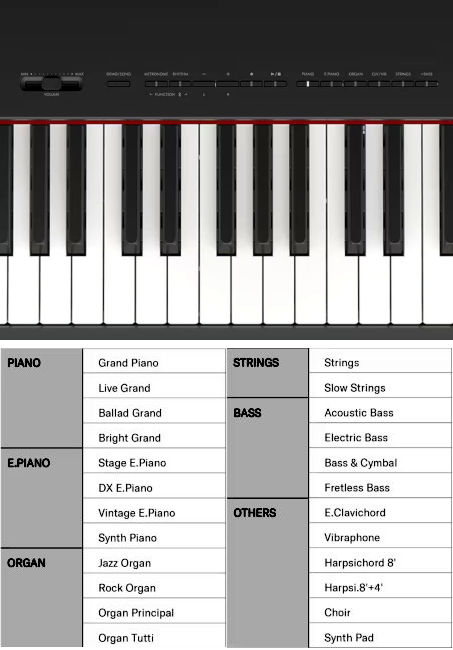 ЗАПИС- можна записати одну пісню (11 000 нот) на дві доріжки, які можна відтворювати разом або окремо. Дуже корисно для вивчення та керування власною грою.