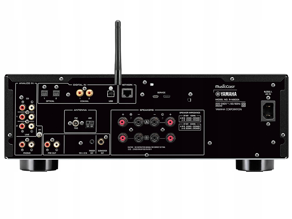 Приймач оснащений різними цифровими та аналоговими роз'ємами. Серед них ми знайдемо, серед іншого: 2 входи RCA (включаючи вхід фоно), а також роз'єм USB-B, що дозволяє підтримувати відтворення аудіоконтенту високої роздільної здатності (DSD 11,2 МГц і PCM до 384 кГц). На задній панелі цього стереомережевого ресивера також є оптичні та коаксіальні входи та вихід для активного сабвуфера. Спереду є вихід для навушників.