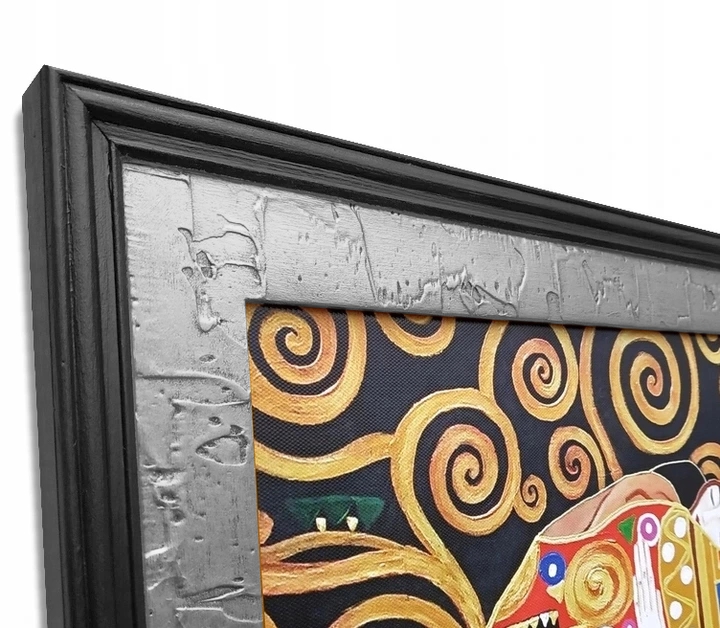 - картина обрамлена в багато прикрашену срібну дерев’яну раму з чорною декоративною смугою