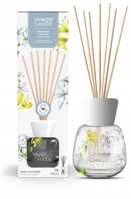 Елегантний дифузор янкі Свічка опівночі жасмин із запахом нічного жасмину, апельсинової квітки та неролі. Природний запах випускає до 10 тижнів. Скляна пляшка з паличками з ротанга вводить мир та романтизм з інтер’єром.